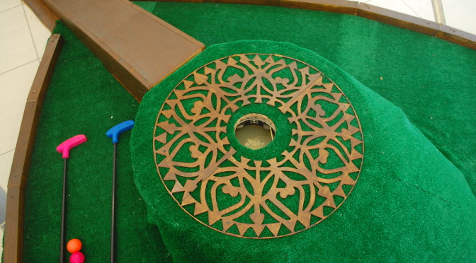 Birdie – This course pleasantly surprised me with its quality decor and fun variety of play. There was a coherent jungle theme that transitioned into an underwater world motif and then back out to the jungle. The walls were covered in black light paintings of animals amidst lush foliage that were tastefully done. Obstacles took the form of tigers, elephants, parrots, snakes, turtles and crocodiles, as well as classics like tunnels and loops. We even encountered a hole with moving floor boards that went up and down randomly, this was a first for us! There was also a windmill-like obstacle disguised as a spinning starfish, a curved ramp with a rotating bar and a pachinko-style final hole. Unfortunately, the weekend that we went to Vegas happened to be the coldest of the year so it was nice to play indoors. Most of the time it’s just the opposite; you’d want to play indoors to escape the oppressive heat of the desert sun. We didn’t have to wait in any lines, another plus. On the down side, the background music was a pop/top-forty station. Overall, King Putt had a lot to offer, but wasn’t quite up to standards with KISS, therefore it comes in at a strong birdie.