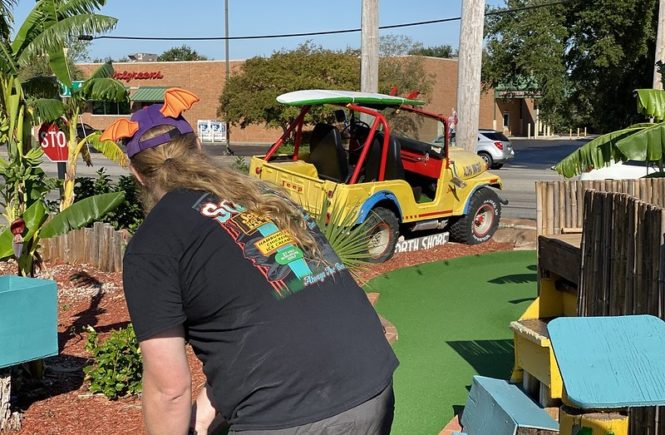Our summer trip out east coincided with my yearly aging reminder (aka my birthday) and for this day I was to be without the Pink Putter for the first half of the day because she was attending to her role as part of the bridal party for her friend’s wedding. Anticipating this free time I planned on getting in some mini golf and wrangled two other guys who’s gals were also in the bridal party. Unbeknownst to me, Lancaster, Pennsylvania is a bustling tourist area and my online reconnoissance of this city uncovered 9 courses near where we were staying. After searching through pictures and descriptions, Professor Hacker’s seemed to be the most compelling option. I mean, come on; they have a massive boat in the middle of the course. My two playing partners, Mike and Tom, were excellent sports and indulged my birthday desire to play both of the courses. With blazing hot weather beaming down our necks, we searched high and low for a golden golf experience.