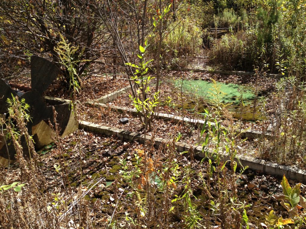 I knew it had closed and was curious about the remnants. When we arrived on location, we found the overgrown remains of what was once a place with mini golf, video games, go-karts, and bumper boats. I snapped the photos below on my phone from behind the fence and within minutes of arriving, a vehicle pulled up into the parking lot. A person confronted us and questioned us about why we were there. They were responsible for overseeing the property and lived in the area. We told him about our blog and that we just wanted to see what shape the course was in since I played it a bunch as a kid. He let us go without much more of a hassle and we took off a little shook but how quickly that guy showed up.