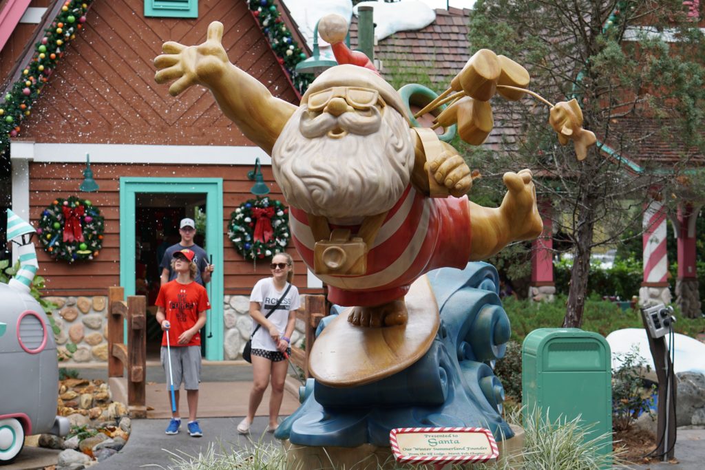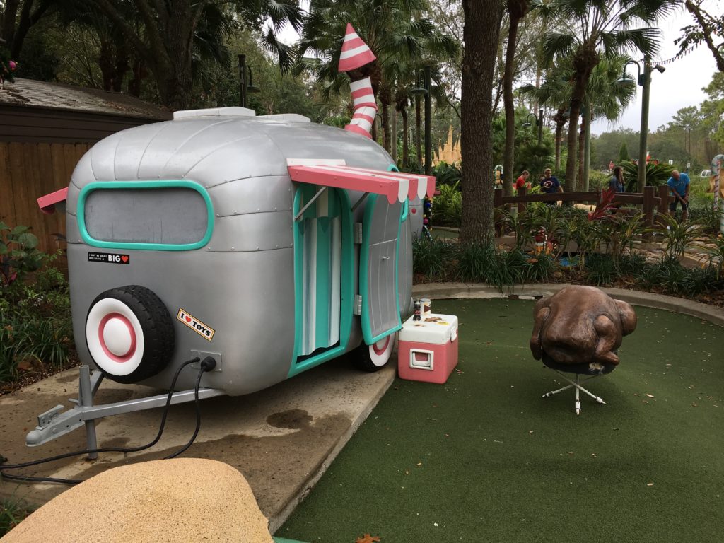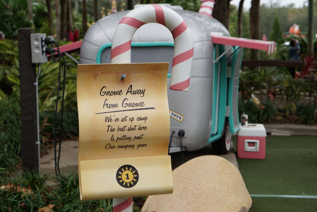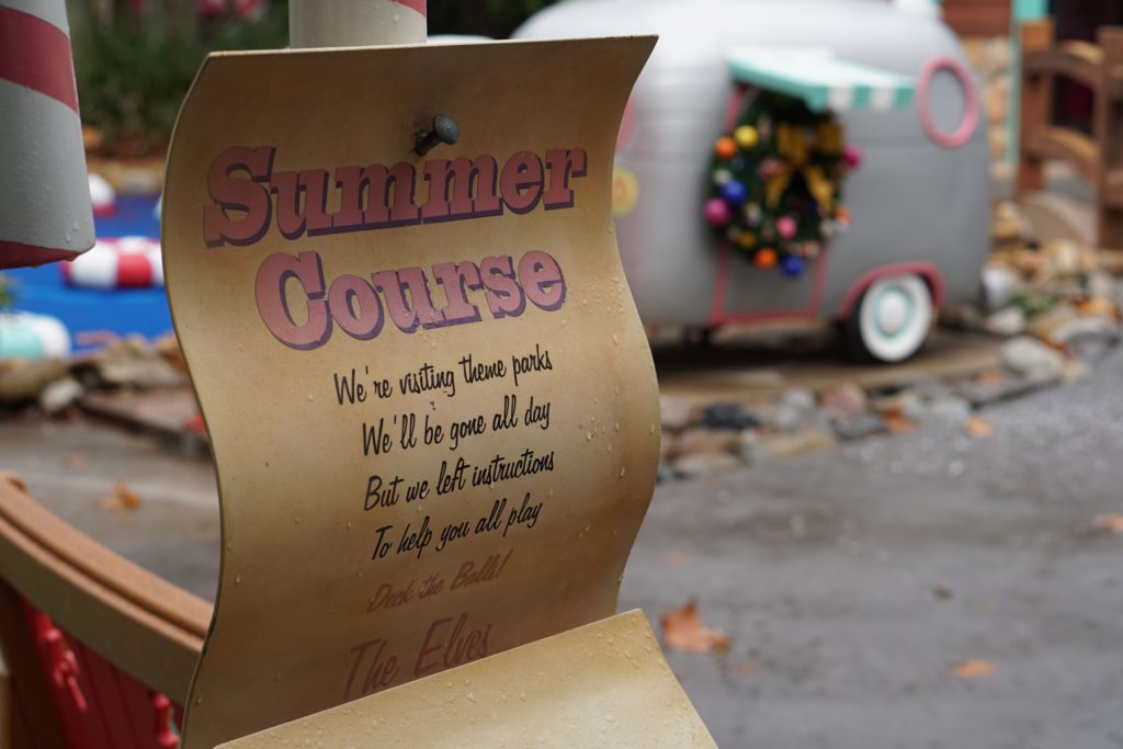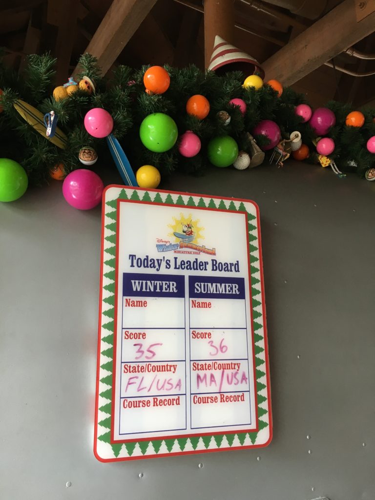Hole-in-One – From the front entrance to the final hole, no detail of this course went unnoticed. In true Disney fashion, the immaculate theming all started with a story line. The Christmas season just ended and Santa and his off-duty elves set up a tropical vacation camp filled with sandcastles, surfboards and swimming pools. These are just a few of the fun thematic elements that you’ll putt through in Summerland. Small details like funny stickers on the back of the elve’s camper trailers, sound effects and a fake snow machine added a lot to the narrative. At the start of each hole, players are greeted by a giant candy cane stanchion with a clever rhyme that describes the hole, the story behind it and a hint at what to aim for. Every hole has a thoughtful fun, unique and immersive game play element to it, including fish that spray water, a moving sandcastle door, a giant ribbon loop, an Archemedes screw North Pole and a revolving Christmas tree, to name a few. And in addition to the faux beach landscape, players are surrounded by the pop tunes of the early Beach Boys. Once again, Disney has created an experience that successfully transports players into a whole different world. We also noticed some interesting similarities between Summerland and Universal’s Hollywood Drive-In Golf including sleeping/snoring characters buried underground (the graveyard hole at Ghostly Greens and Santa and his Elves sleeping in the sand) and characters spitting out water when you cross a bridge (aliens at Ghostly Greens and the fish at Hole 3 in Summerland). Since Winter Summerland opened in 1999 and Hollywood Drive-In Golf opened in 2012, it should come as little surprise that the designers at Universal were heavily inspired by their Disney competition. And while the heavy theming and pristine decor that makes this course feel so Disney does take away from the sense of unique personality that we see at other standout courses like Par King and Urban Putt, it is so well designed that we can’t help but rate this as one of the best courses we’ve played in the country.