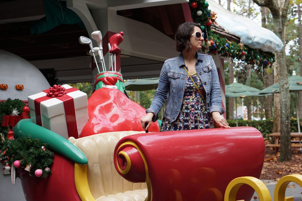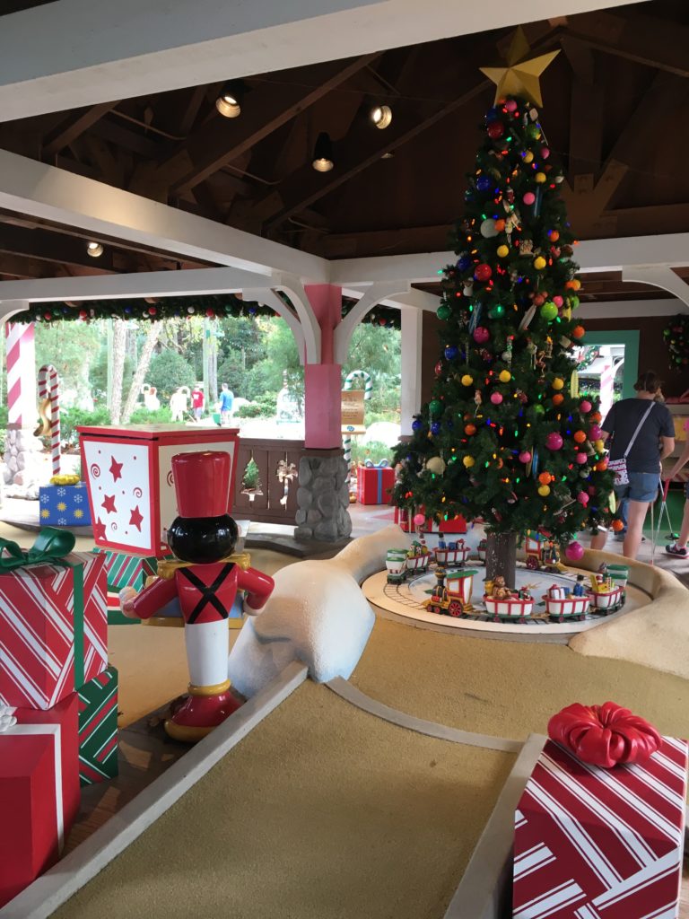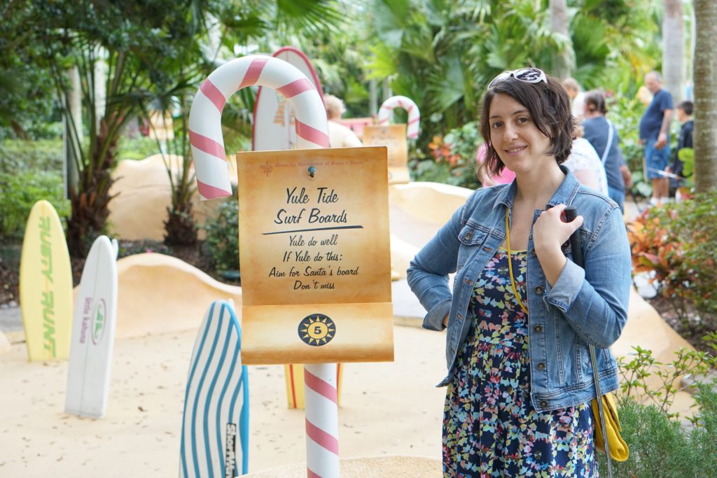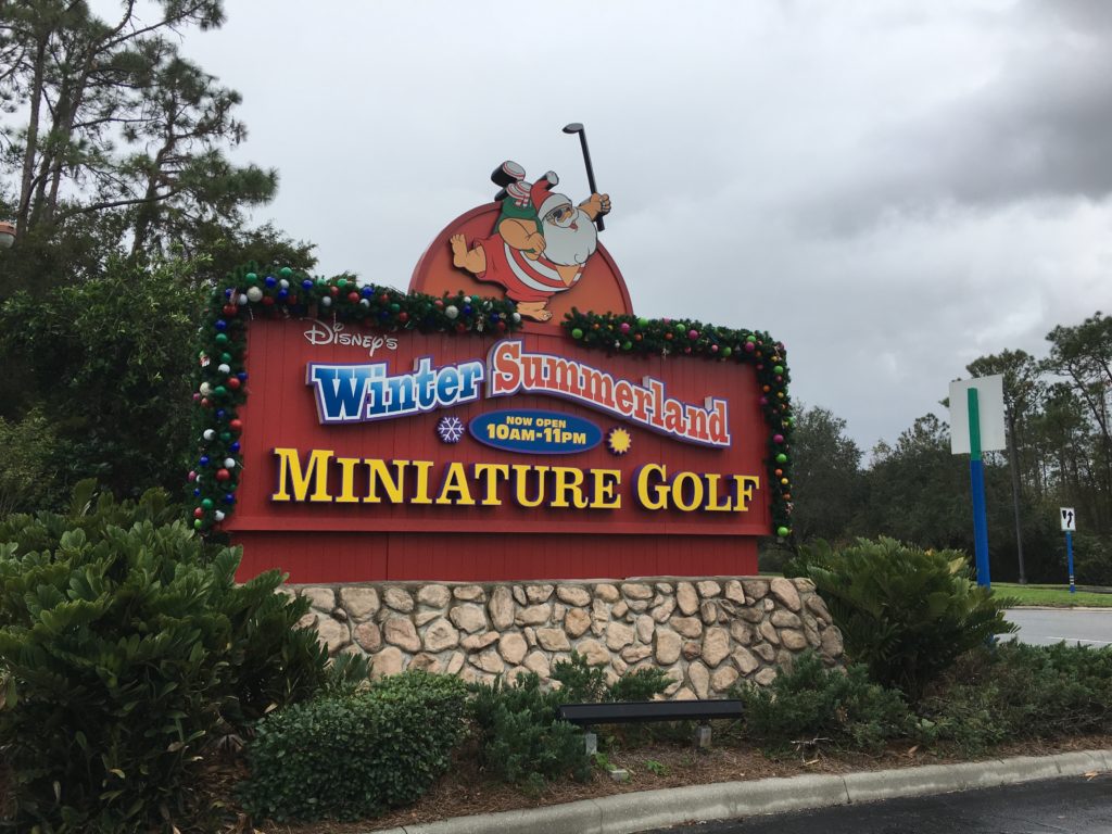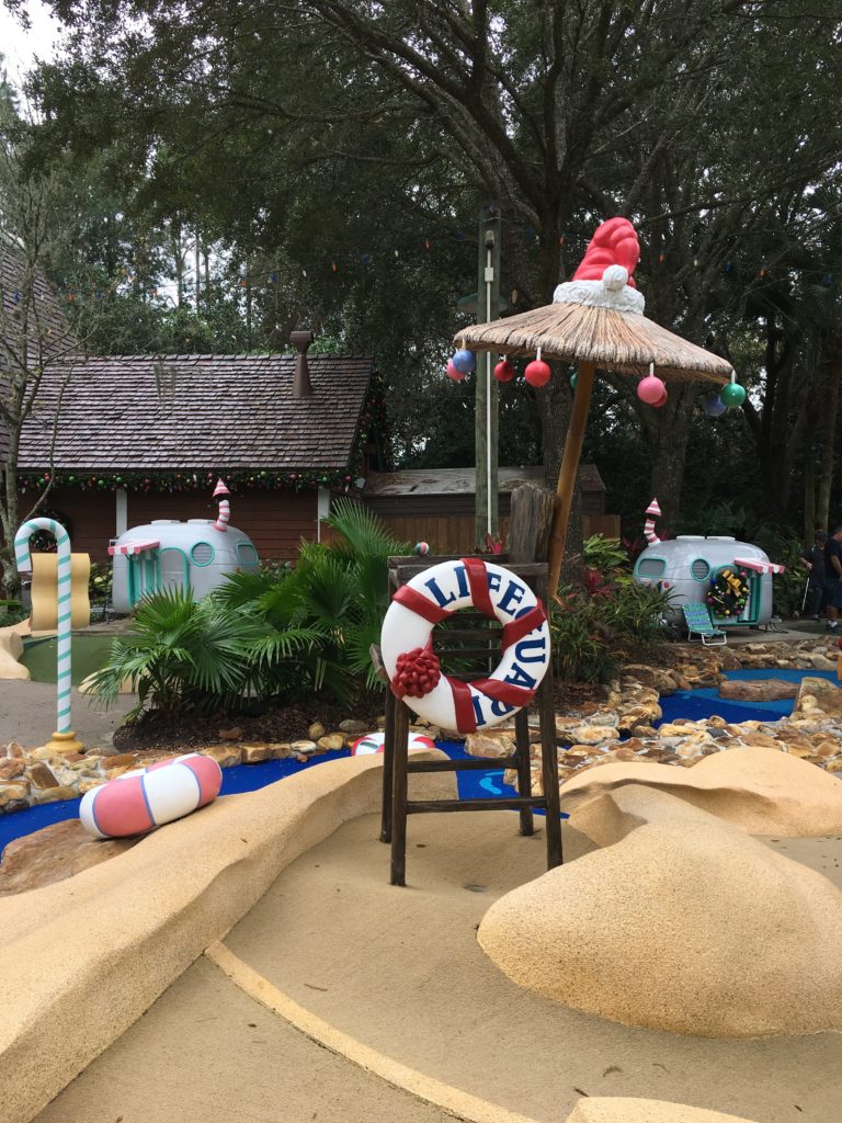 After a lovely evening of mini golf at Universal’s City Walk, we woke up the next morning ready for a Disney adventure. We had a little trouble with the drive to Winter Summerland, as our Google Maps brought us to the Disney Springs shopping area. But after a small detour, we were on our way. Once we arrived at our destination, we got a front parking spot without a problem and headed into this perfectly holiday-themed 36-hole mini golf wonderland. Unlike the Disney Theme Parks, mini golf was pleasantly quiet and did not have horrendous crowds or lines. We started with a round at the Summer Course, aka Sand Course, since there was zero wait time.