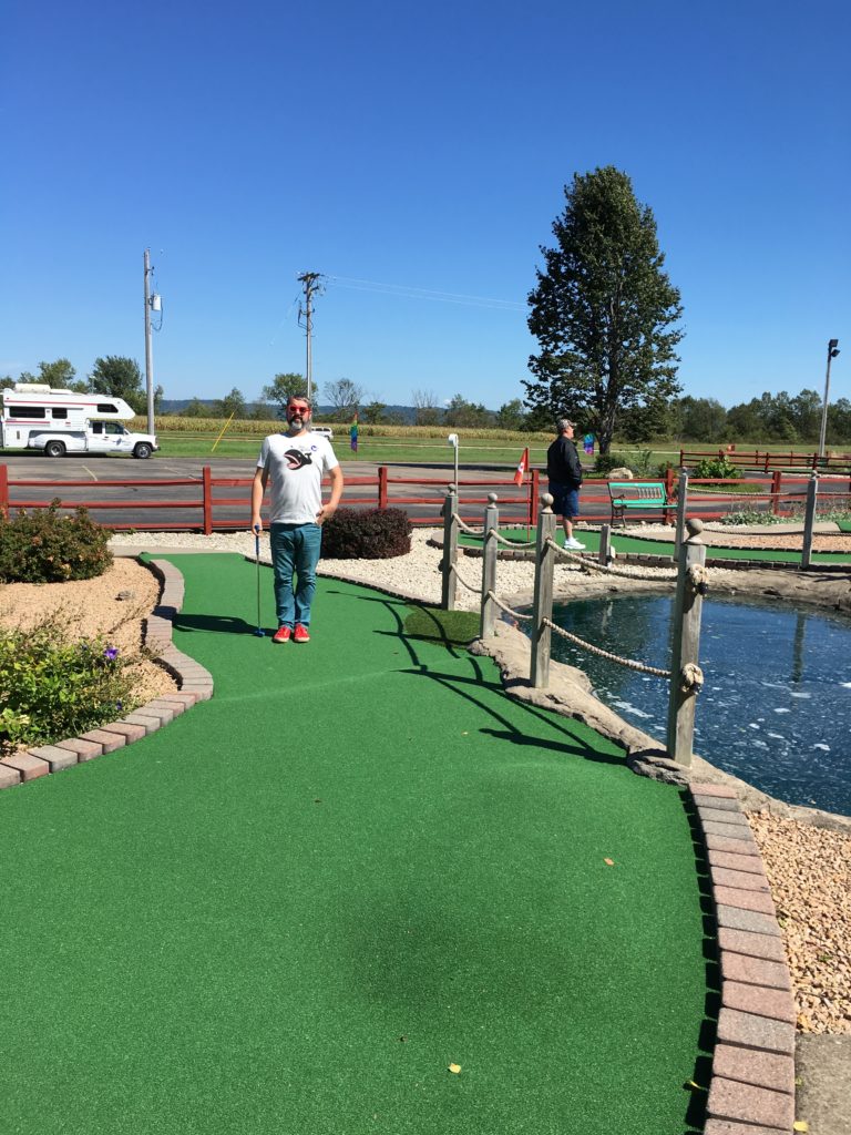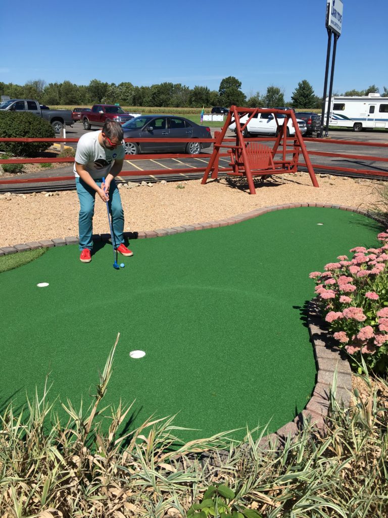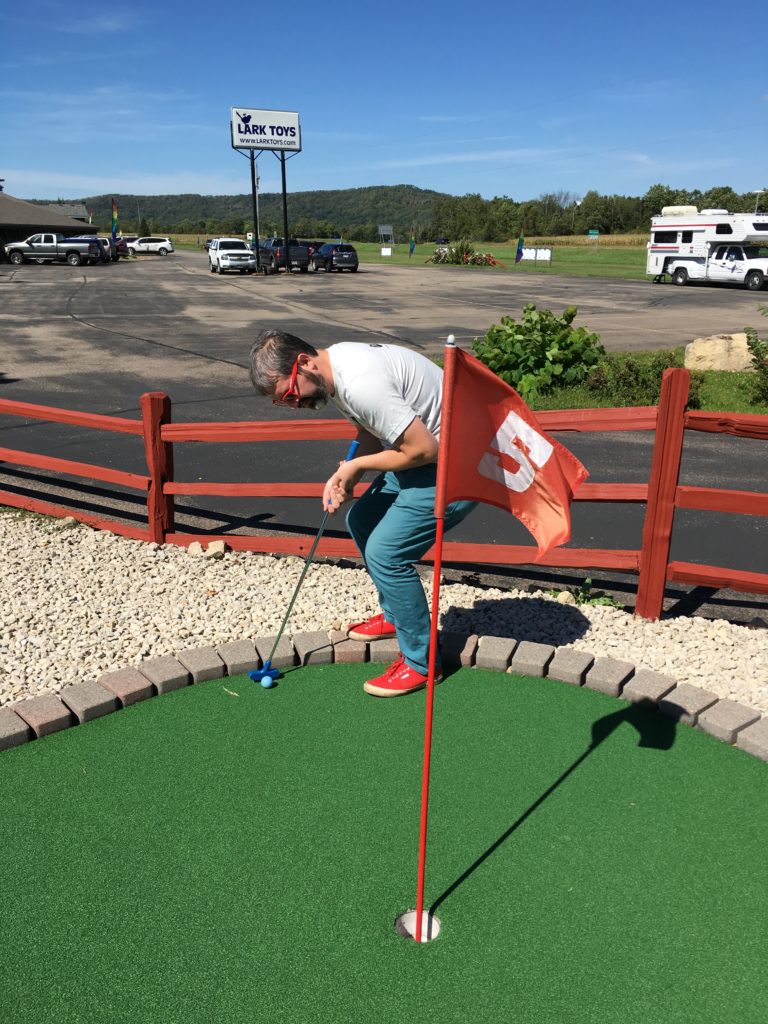It was a warm, beautiful fall and on the 5th anniversary of our first date, we took a weekend road trip down the southern Minnesota/Wisconsin border to picnic, eat pie and play mini golf. We knew about Lark Toys from a trip with my family 4th of July weekend in 2014, but we didn’t get a chance to play the course then. So we came back and enjoyed an afternoon perusing the toy store, saying hi to the llamas and playing mini golf. Lark Toys is a large family attraction complex just off highway 61 in Kellogg, MN. It’s best known for its unique, hand-carved wooden carousel and massive toy store. According to their website, the story goes like this: