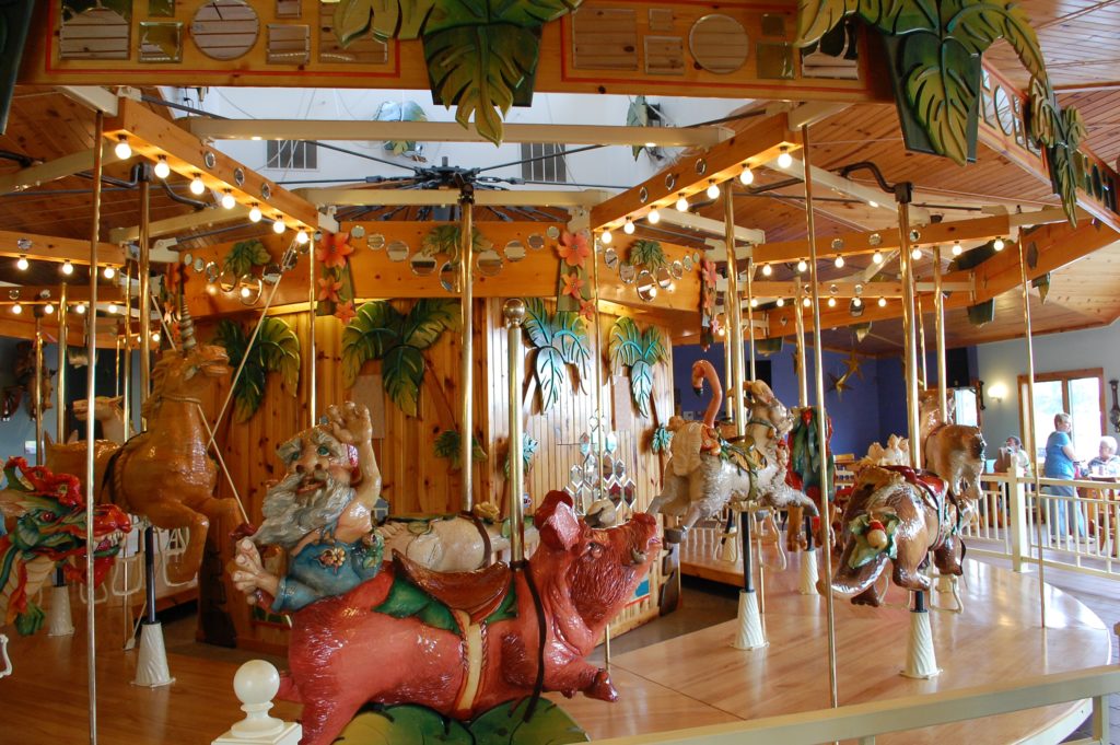 In 1988, Donn began to design a carousel, “the largest toy I could make,” he says. Over a period of nine years, Tim Monson (LARK’s head toymaker) blocked-up the wood; Bill Stark (a local artisan) carved the animals; and LARK artist Mary Eversman hand-stained them. Many visitors had the opportunity to watch the carousel in process. Finally, in 1997, it was ready to begin delighting riders from around the world.