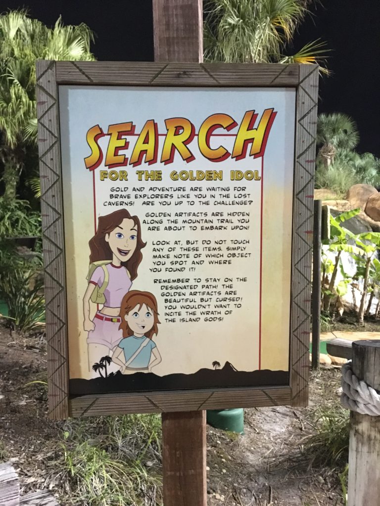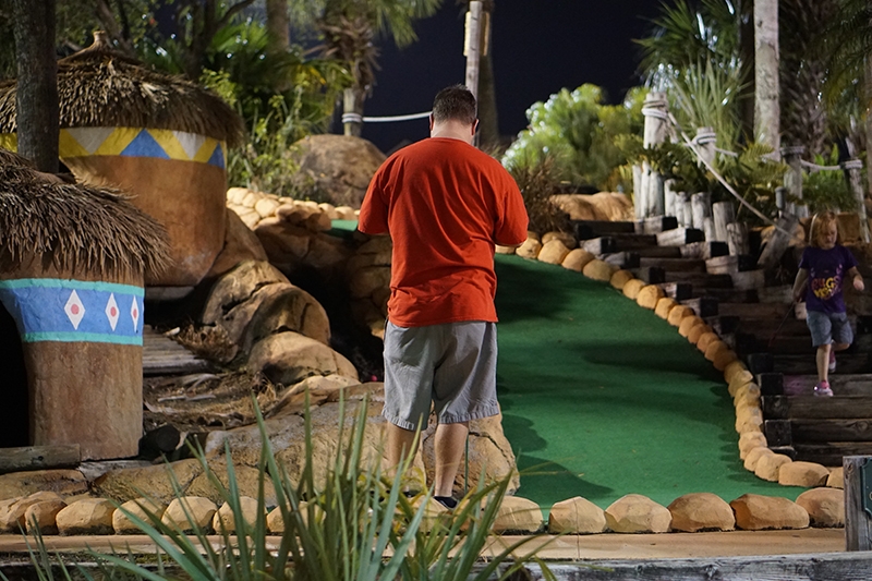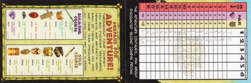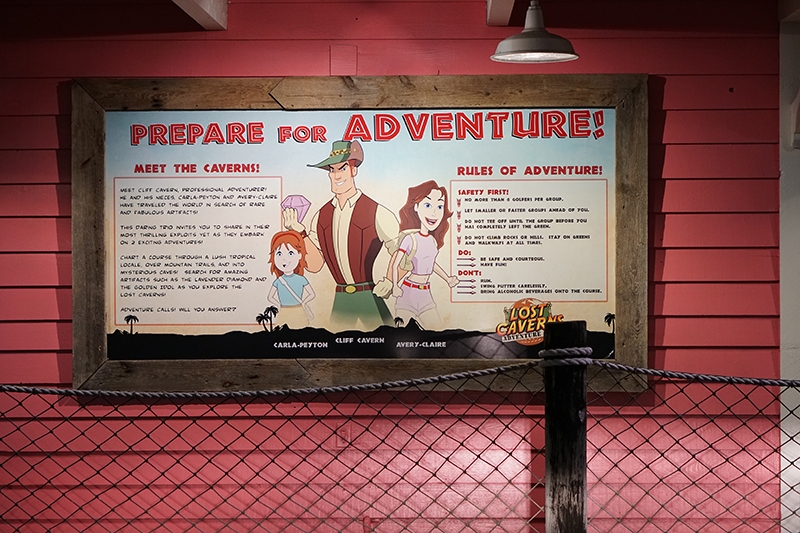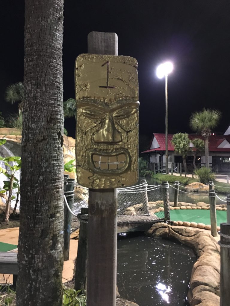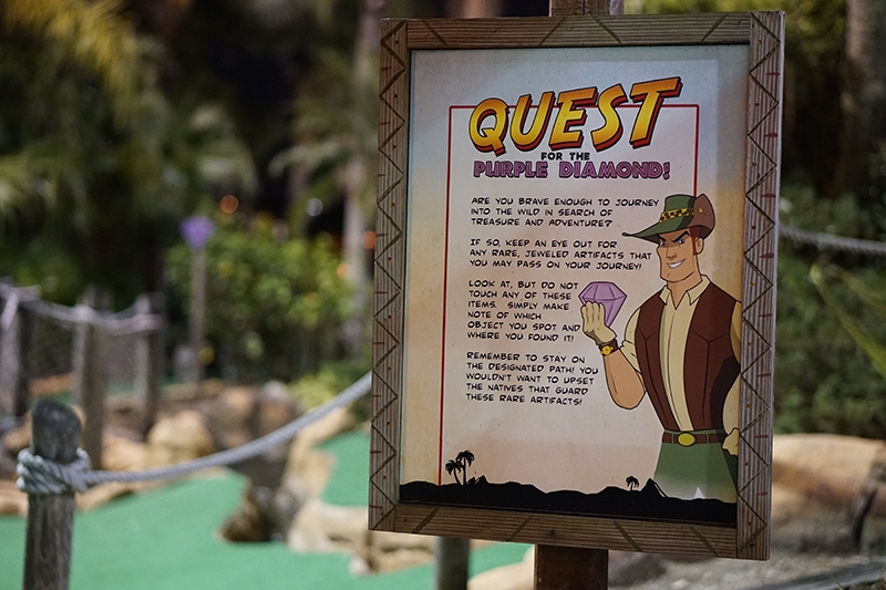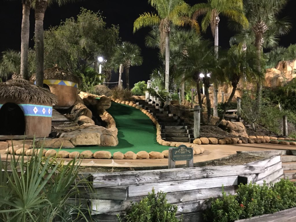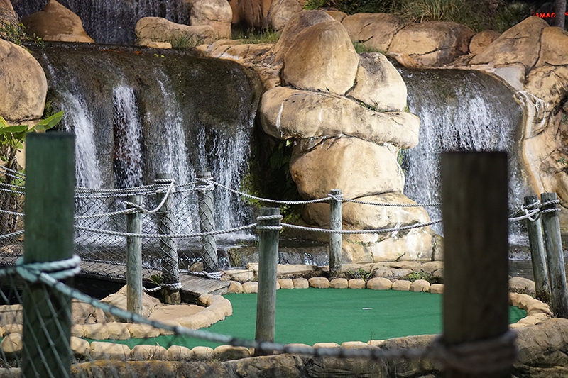 Par – This course had a loose adventure narrative, visually told through waterfalls, caves, thatched huts, mine shafts, themed signage and complete with a scavenger hunt for golden idols. The landscaping was impressive, with undulating terrain that started low, had you work your up to the top of their miniature mountain (where you were rewarded with a grand view overlooking a manmade lake and neighboring hotels), and then looped you back down to where you started. While the gameplay didn’t make use of themed obstacles, it did integrate into the hills and water features are woven into the terrain.