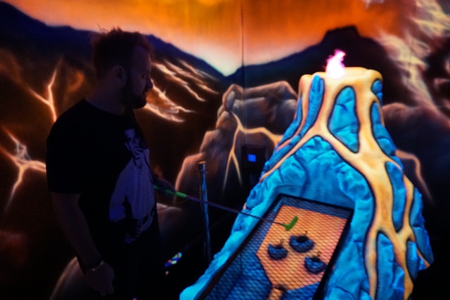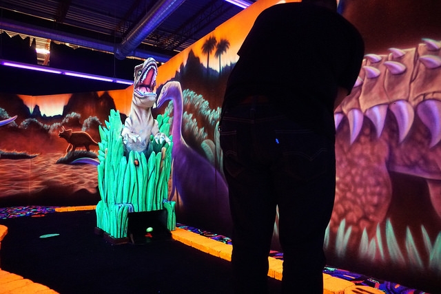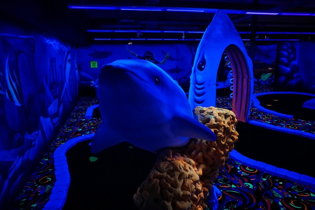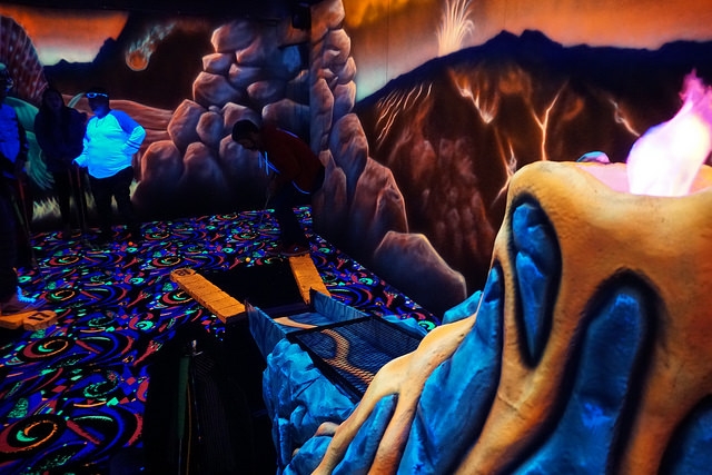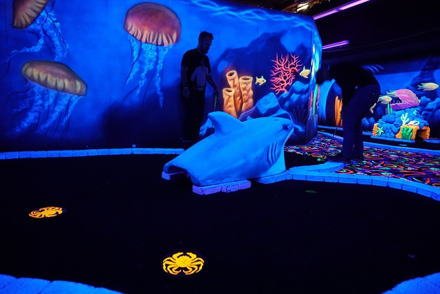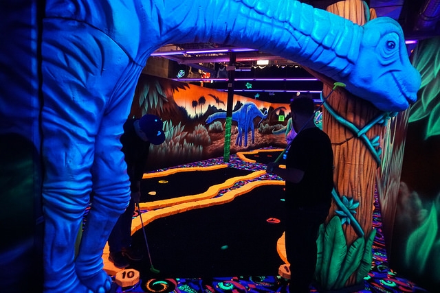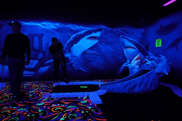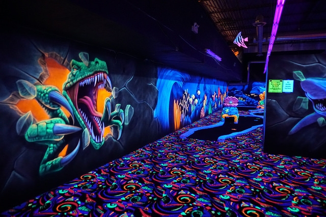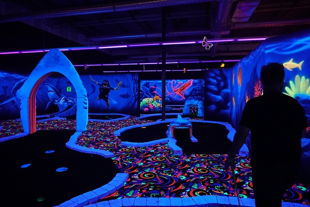 Recently remodeled indoor blacklight mini golf in a Winnipeg entertainment complex.