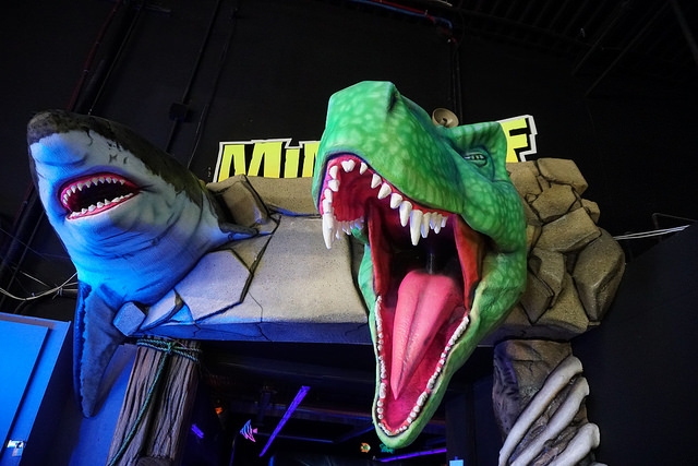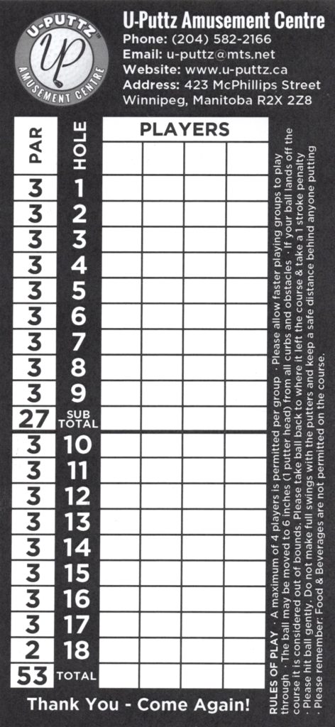 Par – If you piece through our past reviews, you’ll find a pattern. We don’t favor black light mini golf courses over other standard themes or tropes. Feel like we’ve beaten home this point but we undeniably have our preference for what makes a special mini golf experience. There are some standout courses like the Monster Mini Golf locations we played as well as Two Tees and the two King Putt locations near Vegas. U-Puttz added several themed characters, obstacles, and elements that provide creativity in the playing area from a relatively flat carpeted space. The cup placement and layout provided a variety of challenging holes through both the prehistoric and under the ocean themes. A few obstacle elements and ramps were hastily repaired with duct tape. This quick fix hid the damage but the layers of duct tape created an equally frustrating challenge to the path of the ball towards the cup. It’s a solid indoor mini golf option, especially on those cold and dark Winnipeg winter days.