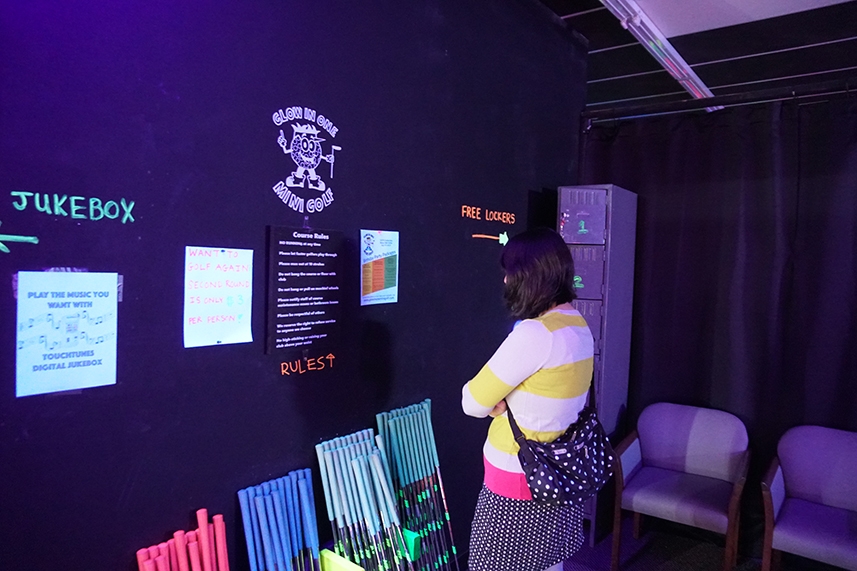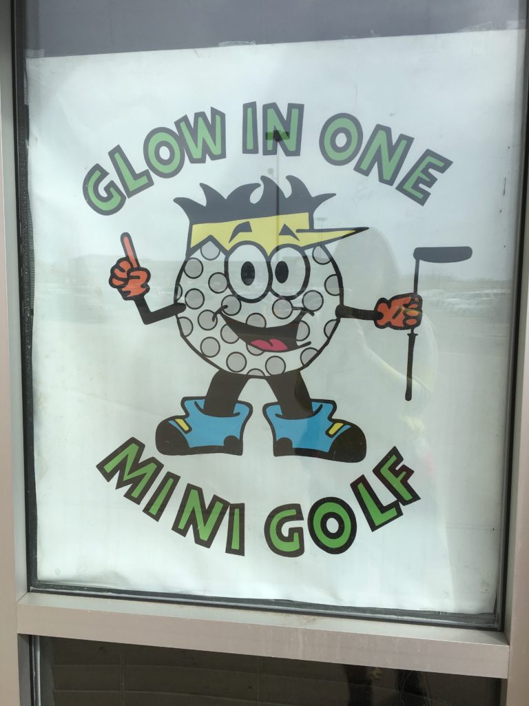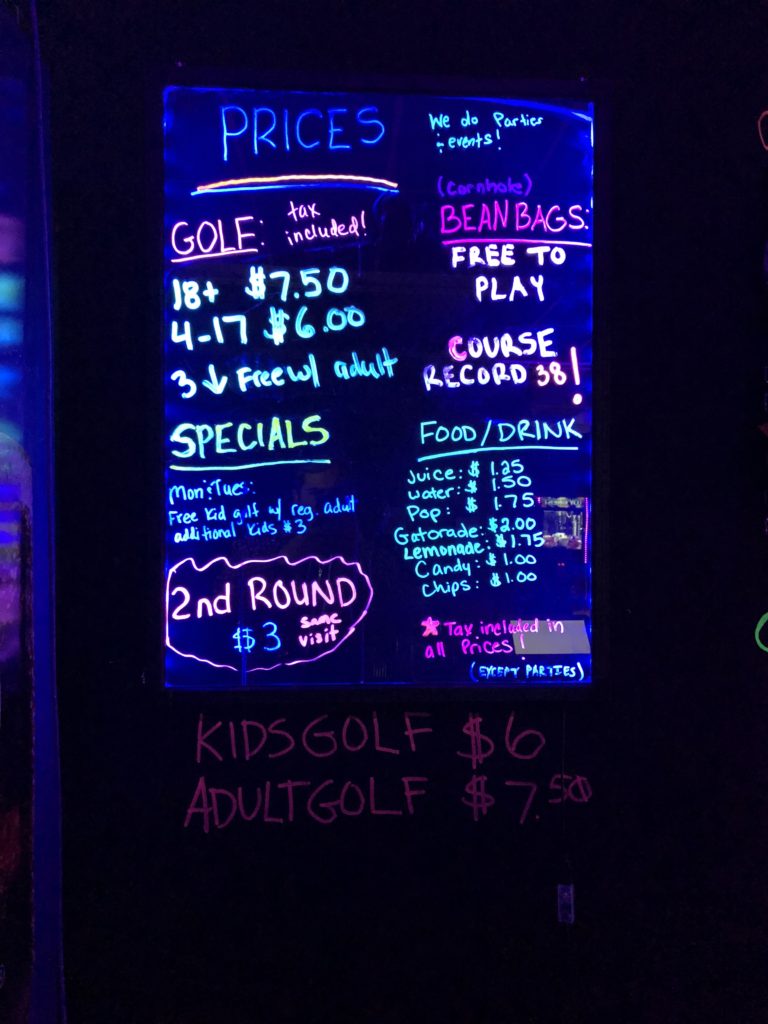 Par – I’m usually not a huge fan of black light mini golf courses, unless they are really spectacular (think Two T’s or KISS). A lot of times I get dizzy, warm, or a little claustrophobic. But we arrived at Glow in One on a quiet Friday afternoon and sharing the course with only one other couple made me feel more calm and at ease. The course appeared to be handmade, evident by the clunky wood barriers, basic obstacles and plain decor. However, despite its simple appearance, Glow in One proved to have challenging and surprisingly fun game play with lots of skill shots that involved calculated angles and a handful of ramps. So much so that I would definitely return to practice and master the hole-in-one shots in hopes of getting my name up on the leaderboard.