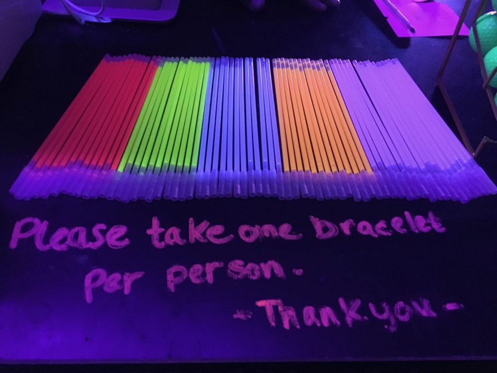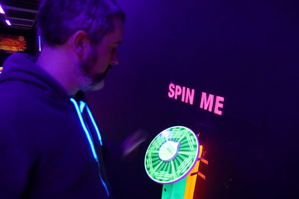In addition to skilled game play, some of the holes had a spinner option with fun prompts such as “dance to the song playing” or “subtract 1 from your score”. The spinner definitely adds an element of chance and whimsy to the overall experience. Other fun touches were the LED lit toilet in the restroom, Party Room with a bonus hole hidden in the back and the free lockers and glow bracelets for players.