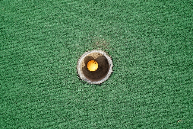 - No flags in holes. Metal putter. Random mini golf balls