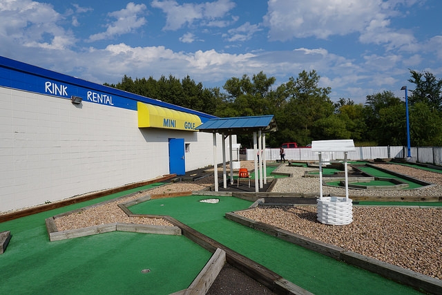 Driving east of the Twin Cities on Highway 36 I could have sworn I saw the words mini golf on the side of a building. Rigorous online digging uncovered a non-descript rollerskating rink with a collection of 9 miniature golf holes. Little information was available which added to the intrigue. At some point, The Pink Putter got hired to draw caricatures at this business. Not impressed, we delayed our documentation of this course despite being it being one of the final long-standing mini golf courses we had yet to play in the Twin Cities metro area. Being a completist, I took this course on solo to mark it off the list and to take one for the team.
