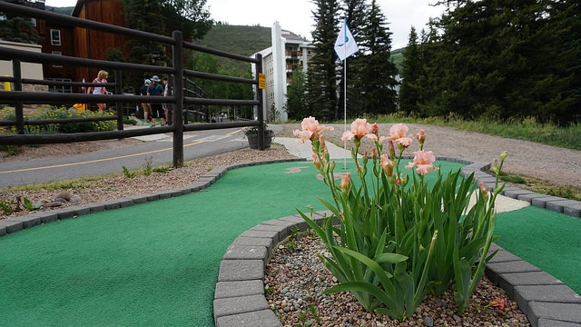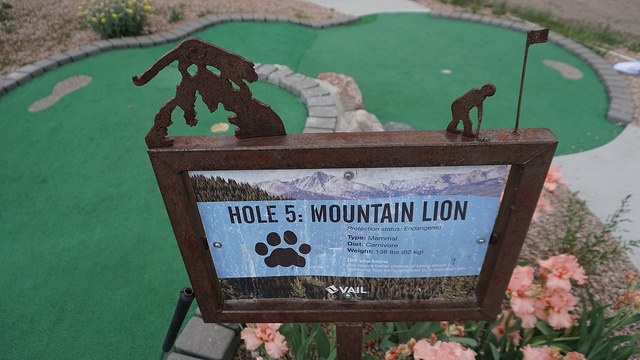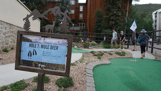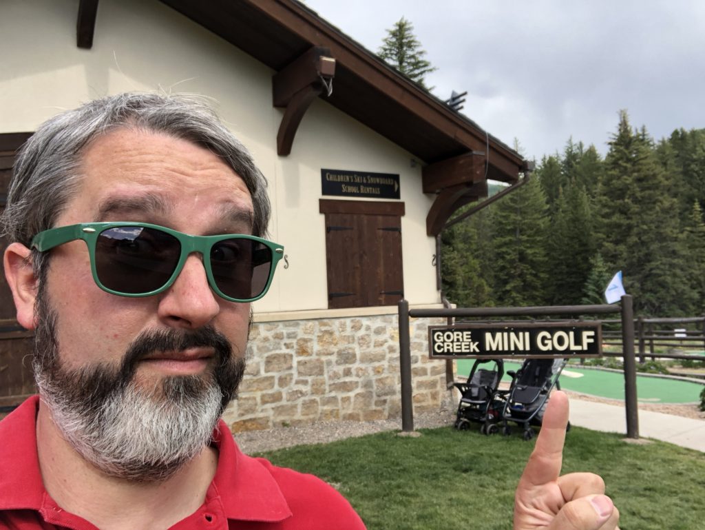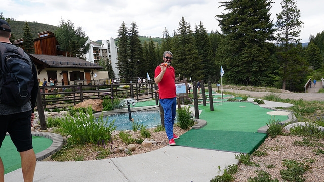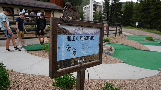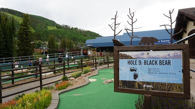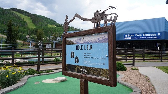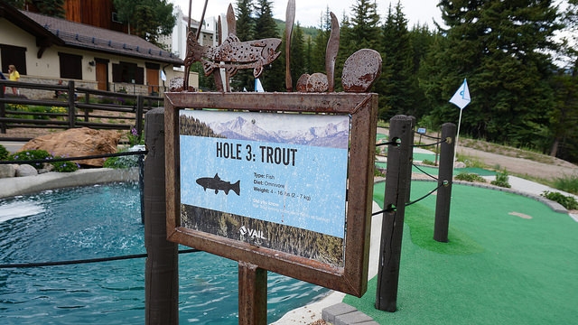 Second round for the day takes me back east down I-70 to another Colorado ski resort town, Vail. The skiing up at both Vail and Beaver Creek is legendary. People travel all around the world in the winter to take in epic slopes. The mountain setting and cooler summer temperatures have extended travel season for mountain resort towns to year round. Back in the early 00’s, I visited the area on trips to see friends in Denver. As I walked up to Gore Creek Mini Golf in Vail, I realized that this wasn’t my first time playing at Vail. The Gore Creek course opened in 2011 but I know I’ve played mini golf in the area years ago.