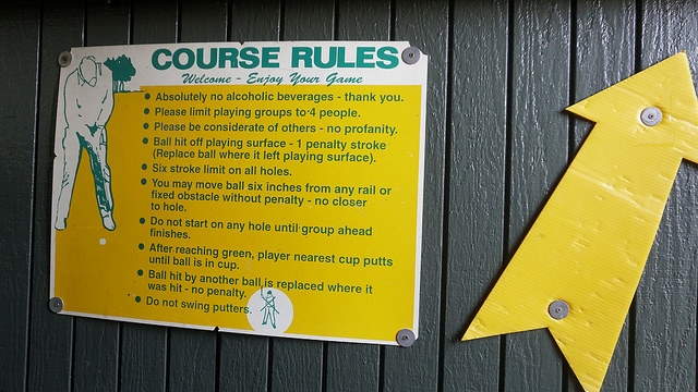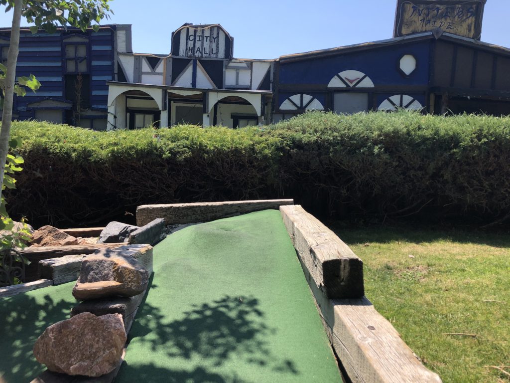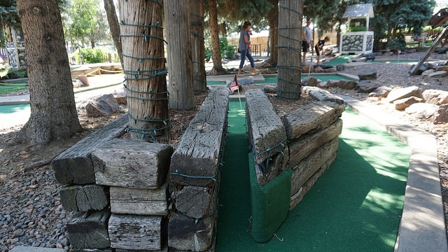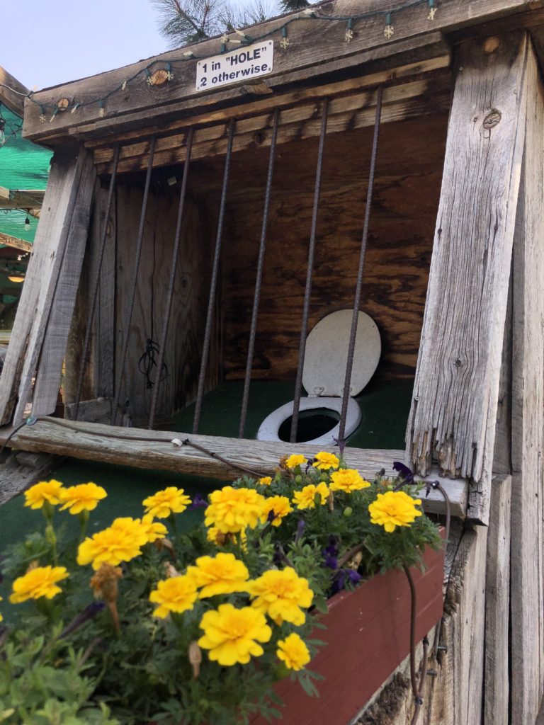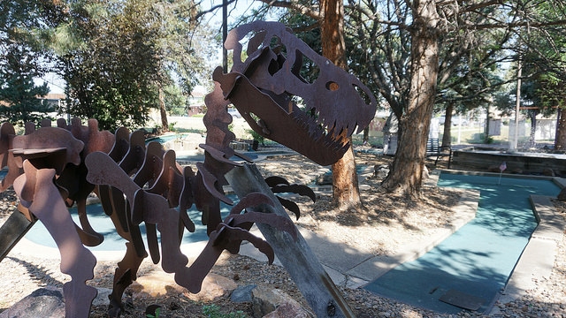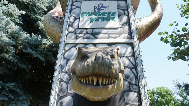 Par – Multiple courses at a single mini golf establishment is almost always a big plus. You’re given additional excuses to return regularly. Putter’s Pride trifecta offered numerous well-designed holes and paths to the cup. While no unifying theme was evident across the whole complex or individual courses, common tropes appeared in the form of dinosaurs and windmills. Pipes, sand traps, shoot through obstacles, and cleverly graded turf made for a classic course worthy of repeated visits. Heck, the $10 all-you-can-play option enticed me to take on all 54 holes on a hot late Summer morning. The course offered me lots of challenges but not all of them were positive. The turf and numerous playing areas require attention. Debris from surrounding trees, well worn putting surfaces, and damaged environments set the ball on unintended paths. A few repairs and better upkeep could easily take this course to the next level.