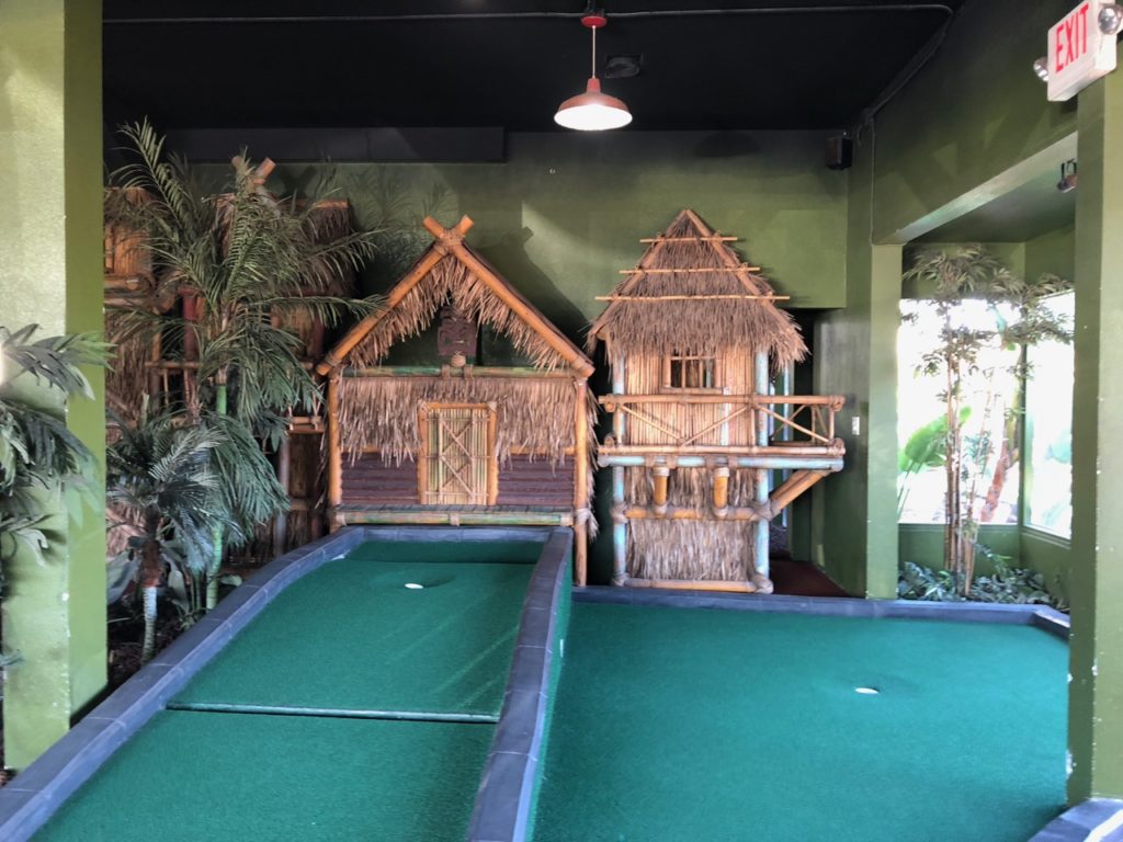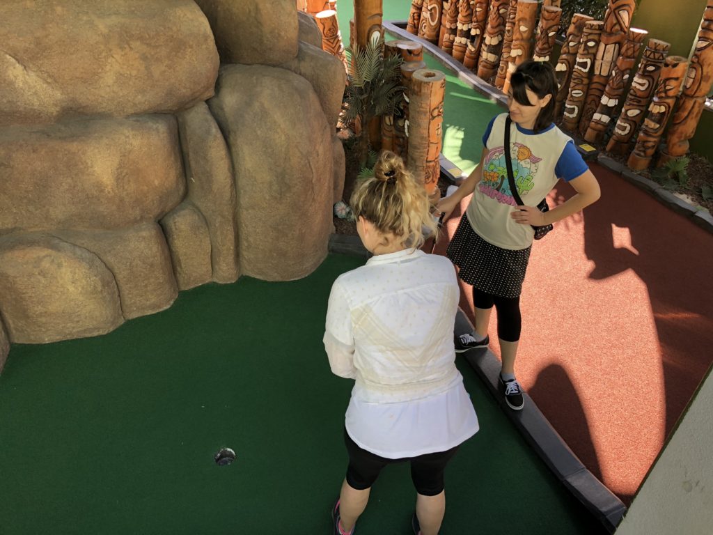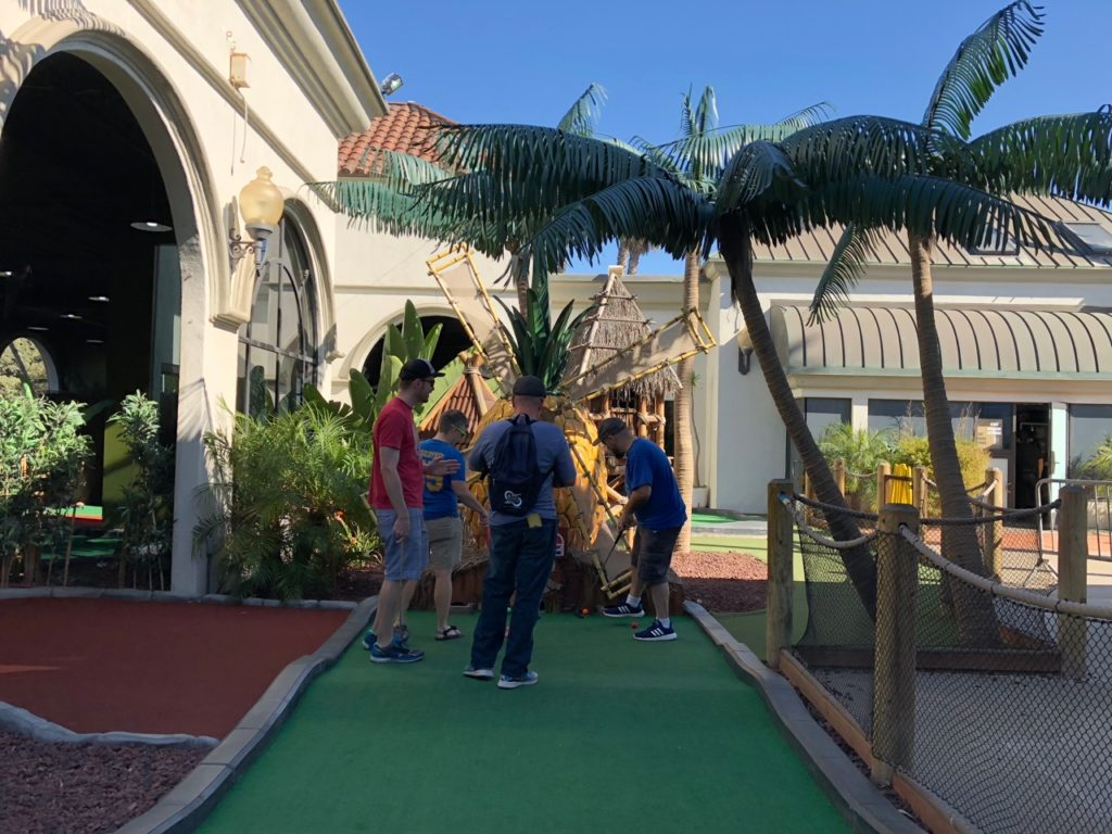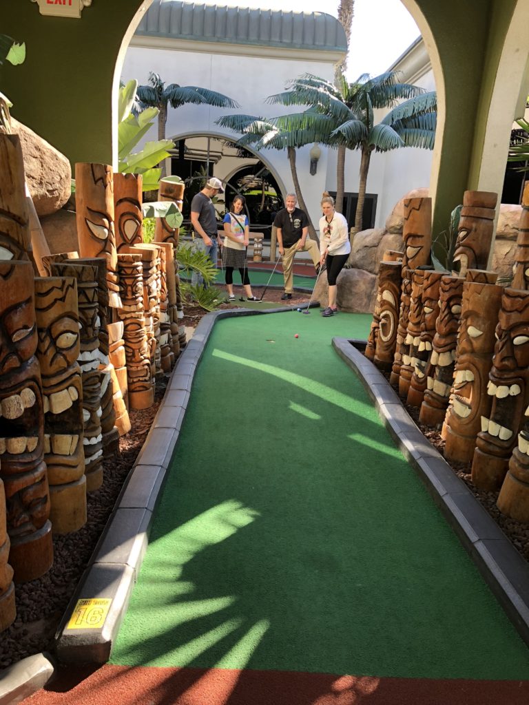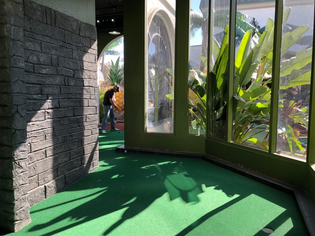 Birdie – Just like its name, Tiki Town had a thorough tiki theme complete with palm trees, thatched roofs, a giant pineapple windmill, tiki gods, a plane crash, a parrot, a giant volcano and more. This course was unique in that it was both indoor and outdoor, with holes and greenways seamlessly weaving in and out between giant wall openings. This created a pleasant, open-air feel that provided the right mix of sunshine and shade. While a lot of the gameplay relied on the classics like angles and slopes, there were some fun and challenging holes that involved shipping crates, a windmill, pipe play and a final skeeball style hole. The bonus of it all was that at the end, there was a Dole Whip stand where we all indulged in a refreshing treat. Tiki Town is a solid course and definitely worth the trip. It was fun as a tourist to visit Belmont Park, take a walk to the beach and end the afternoon with some delicious Mexican food.