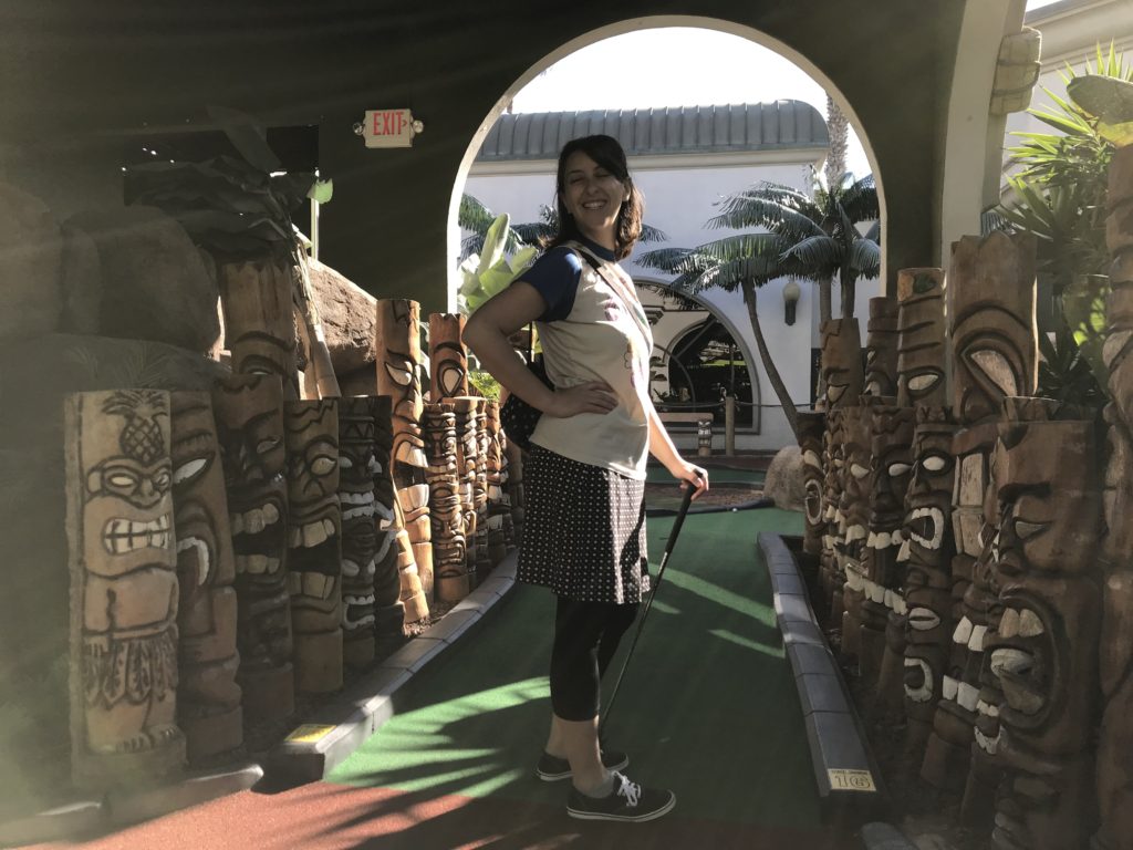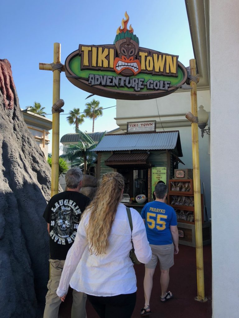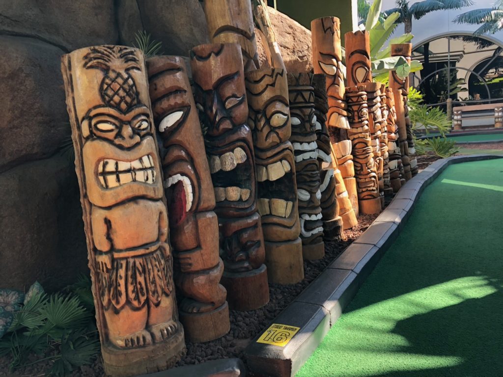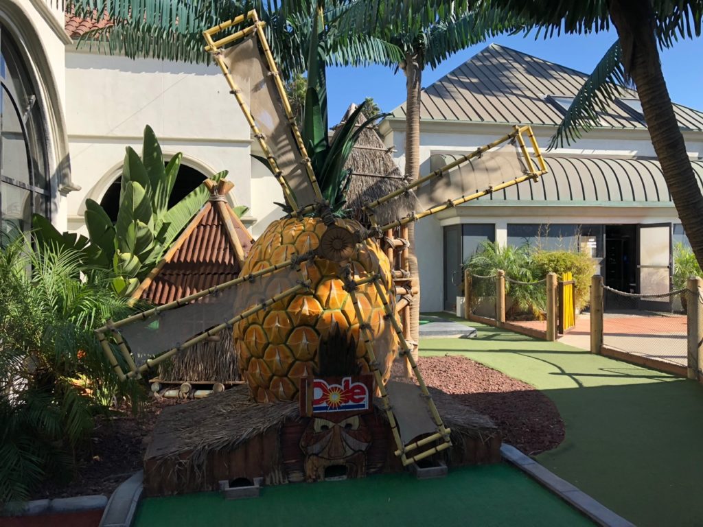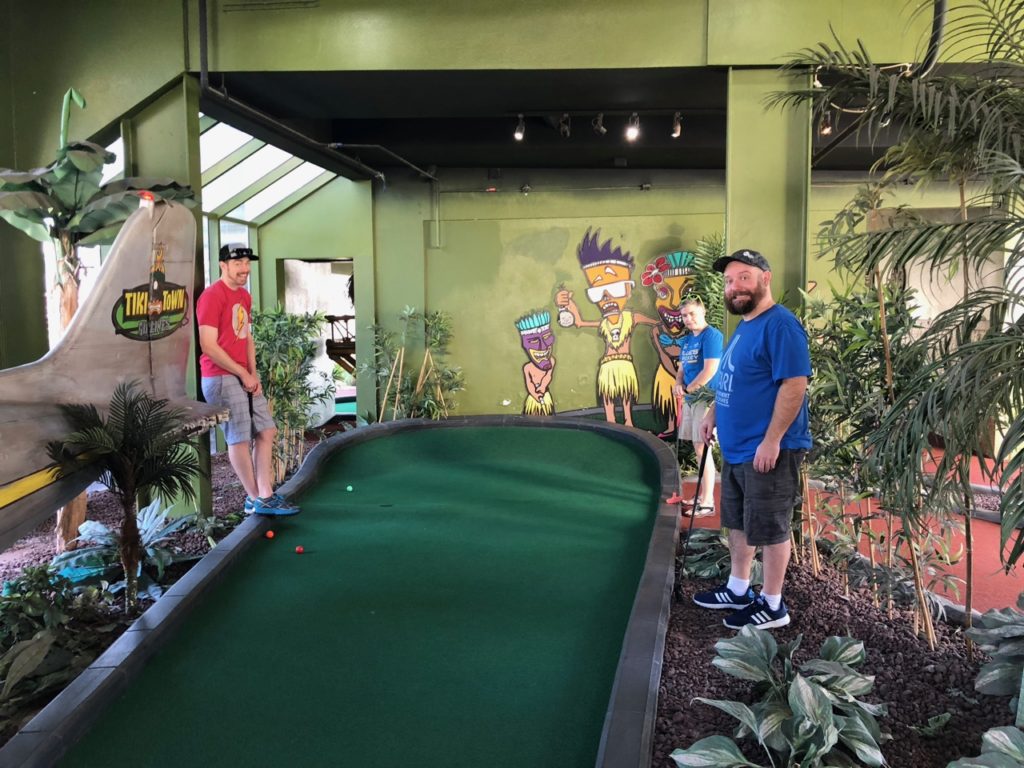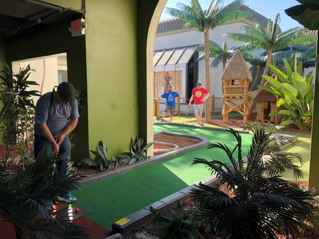 Birdie – Just like its name, Tiki Town had a thorough tiki theme complete with palm trees, thatched roofs, a giant pineapple windmill, tiki gods, a plane crash, a parrot, a giant volcano and more. This course was unique in that it was both indoor and outdoor, with holes and greenways seamlessly weaving in and out between giant wall openings. This created a pleasant, open-air feel that provided the right mix of sunshine and shade. While a lot of the gameplay relied on the classics like angles and slopes, there were some fun and challenging holes that involved shipping crates, a windmill, pipe play and a final skeeball style hole. The bonus of it all was that at the end, there was a Dole Whip stand where we all indulged in a refreshing treat. Tiki Town is a solid course and definitely worth the trip. It was fun as a tourist to visit Belmont Park, take a walk to the beach and end the afternoon with some delicious Mexican food.