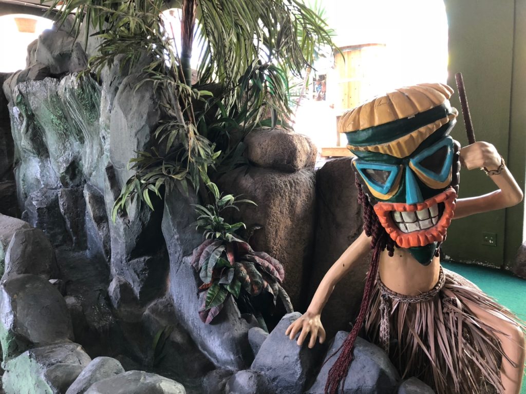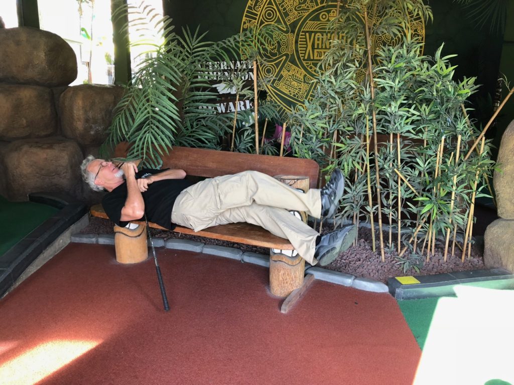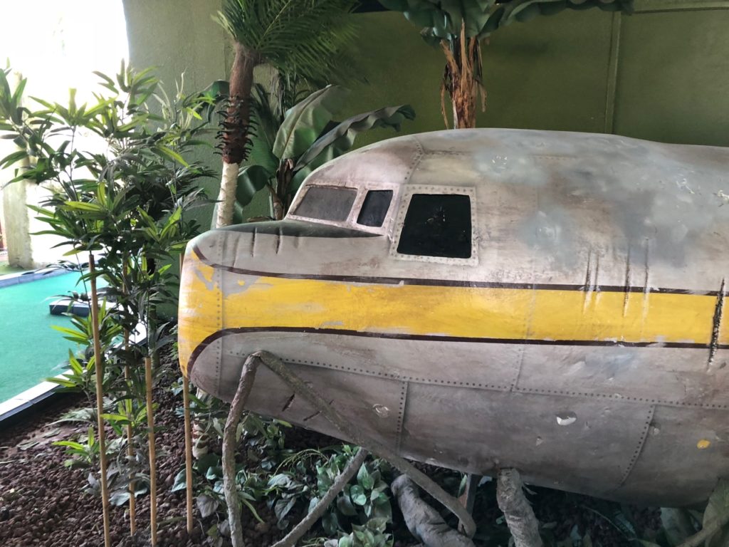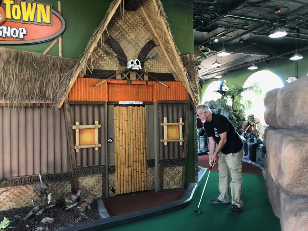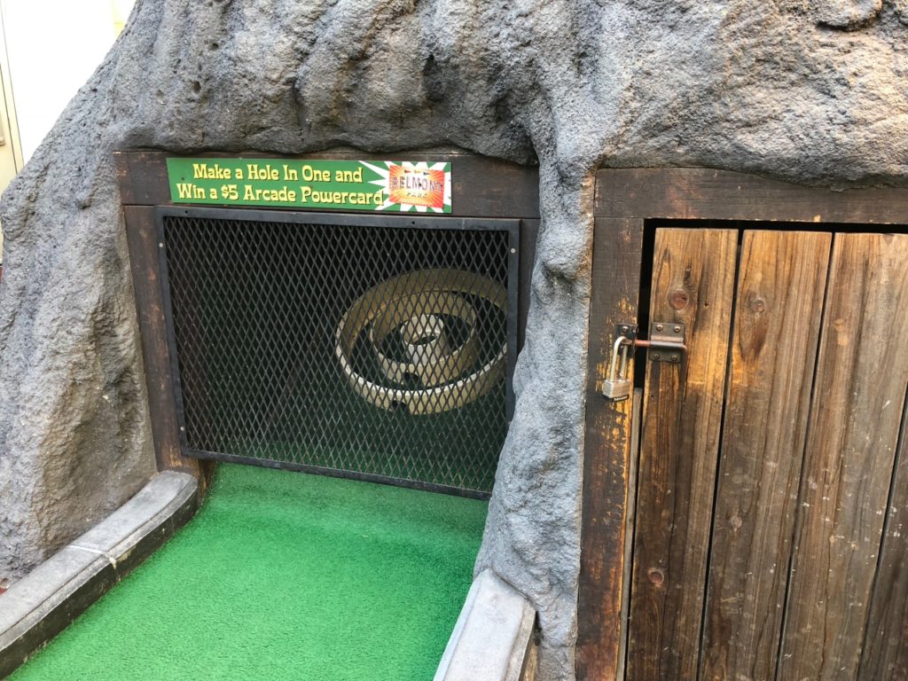 Birdie – Just like its name, Tiki Town had a thorough tiki theme complete with palm trees, thatched roofs, a giant pineapple windmill, tiki gods, a plane crash, a parrot, a giant volcano and more. This course was unique in that it was both indoor and outdoor, with holes and greenways seamlessly weaving in and out between giant wall openings. This created a pleasant, open-air feel that provided the right mix of sunshine and shade. While a lot of the gameplay relied on the classics like angles and slopes, there were some fun and challenging holes that involved shipping crates, a windmill, pipe play and a final skeeball style hole. The bonus of it all was that at the end, there was a Dole Whip stand where we all indulged in a refreshing treat. Tiki Town is a solid course and definitely worth the trip. It was fun as a tourist to visit Belmont Park, take a walk to the beach and end the afternoon with some delicious Mexican food.