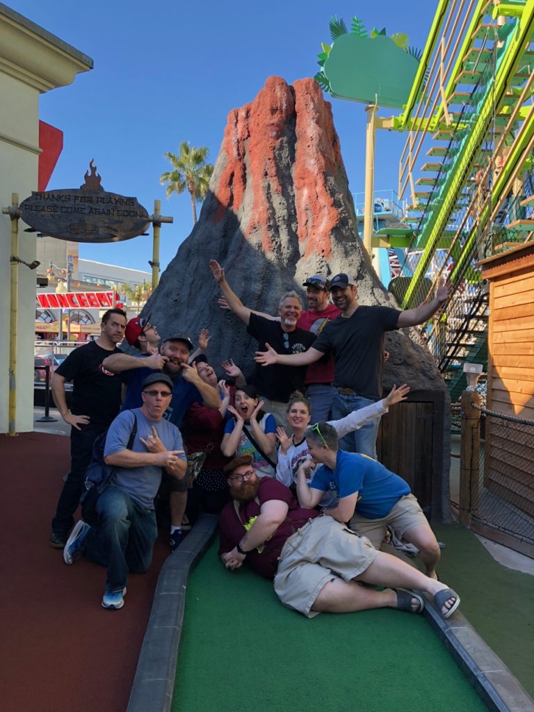 After a week of intense drawing, competition and camaraderie at the 27th annual ISCA Convention, I thought it’d be fun to organize a second mini golf outing for the week (check out the first!). A group of twelve of us met up on Friday morning, the last day of the Con and headed to Belmont Park at Mission Beach to play Tiki Town Adventure Golf. This time the crew included Erik Roadfeldt, Don Pinsent, Erin Goedtel, Thomas Counts, Chuck Bennis, Katie Green and her husband, A.J. Mathenia, Brian Denisiuk, Brian Smales and Casey Christenson. We broke into three teams of four for some friendly competition and Casey ended up winning the whole thing with a low score of 40.
