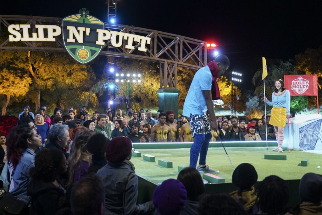 “Power of the Fanny Pack” It’s the grand “Holey Moley” finale that concludes our supersized season one. The season finale opens on the massive “Arc De Trigolf” where one contestant finds himself in the water before he realizes that his ball didn’t even make it across the arc. Later on, this challenging hole trips up two more competitors as both fall into the icy water while attempting to get across before their ball does. Meanwhile, Stephen Curry gives contestants advice for “Slip N Putt,” where there is a photo-finish race to the top of the glacier. Over on “The Distractor,” a firefighter contestant looks to come out on top over the fire breathing distraction. In the nail-biting final round of “Mt. Holey Moley,” all three finalists nearly miss the landing from the zipline, which would cost them a one-stroke penalty, but that doesn’t stop one competitor’s hat from flying into the water! Joining in on the season finale fun is none other than gymnast and three-time Olympic medalist Gabby Douglas, who not only helps out commentating but shows off some fun tricks on “Log Roll” as well. More surprises await during “Power of the Fanny Pack,” airingTHURSDAY, AUG. 22 (9:00-10:00 p.m. EDT), on ABC. (TV-PG, L) Episodes can also be viewed the next day on ABC.com, the ABC app and Hulu.