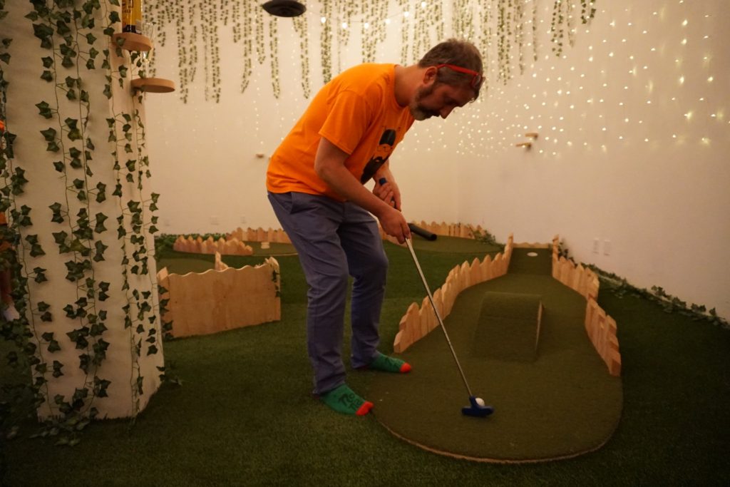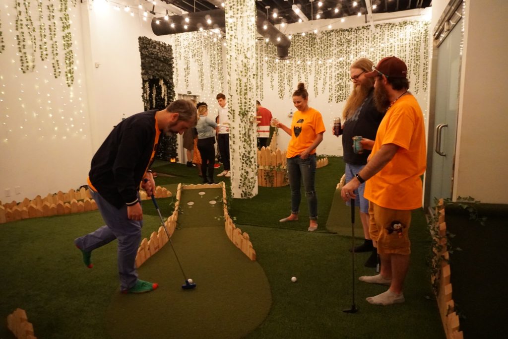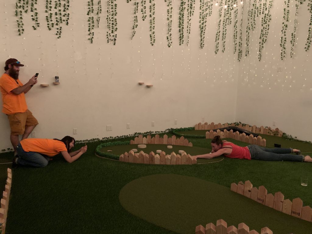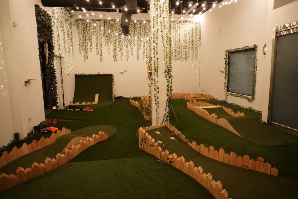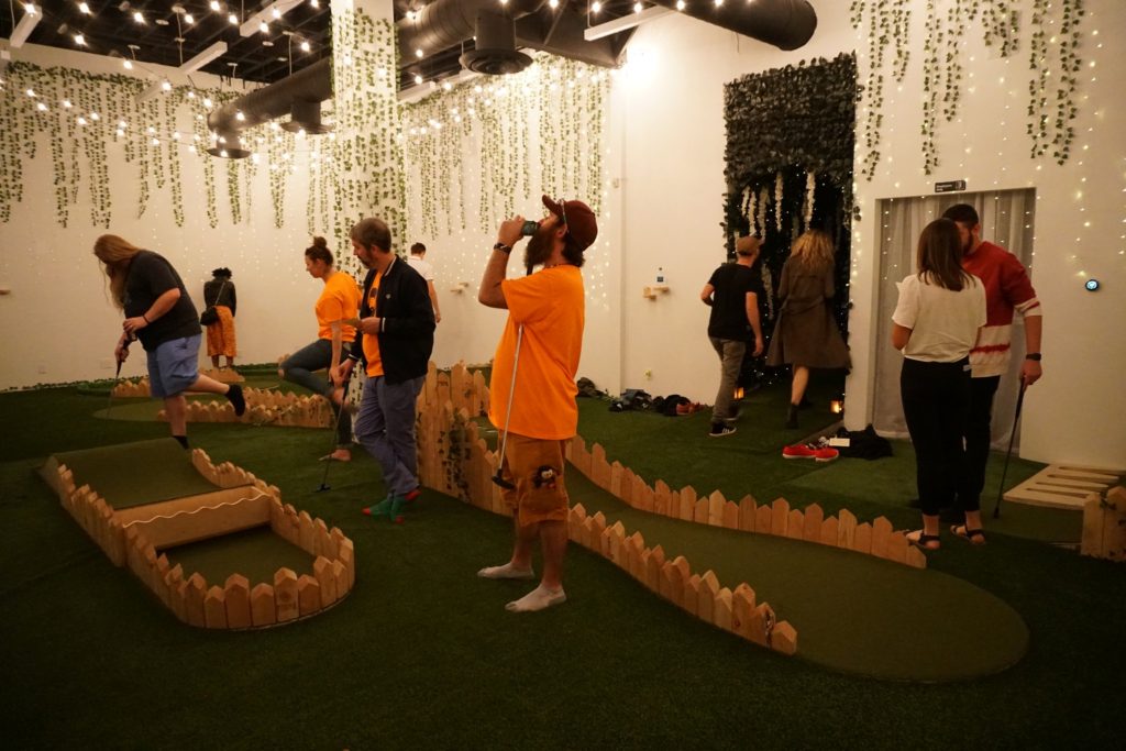 Birdie – This pop-up 9-hole miniature golf course and bar was open in Los Angeles for 8 weeks in April. Inspired by UK’s Swingers style putting greens, this space was intimate and entertaining. Entering through an alleyway, we found the bar area, a space with faux hedge covered walls. It was brightly lit by the sun which poured through the windows of its large garage doors as well as string lights hanging overhead. The bar area had chairs and tables for sitting, as well as a secondary area with plush couches and a large projection screen. Just off this room was a faux ivy-covered hallway which led to the mini golf course. The whole course was located in a small and cozy room with the floor entirely covered in turf, encouraging us to immediately kick off our shoes and play in our bare feet or socks. There were conveniently placed shelves along the walls and columns of the room for setting our drinks down. The music was blasting. The 9 holes themselves were basic, handmade wood and turf structures that were small but offered various levels of challenge. Although there were no over-the-top obstacles or bright colors, the course had a consistent theme and vibe. The best part about our experience was that we had the entire room/course to ourselves for about an hour so were able to drink, dance, take silly photos and play the course twice in a casual way. For our second round, we opted to all play every hole with our opposite hand and on one foot, just to shake things up.