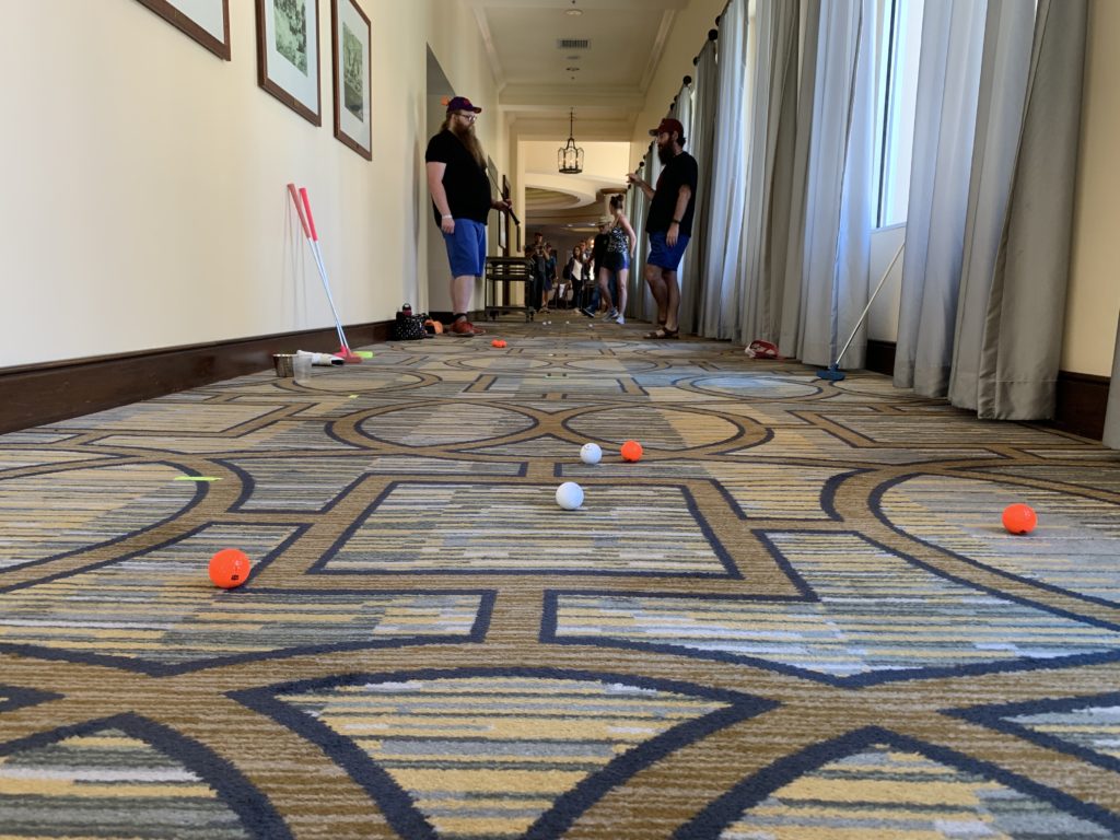 Immediately, we got to know a bunch of the other contestants. There were endless new connections made with a colorful and fun cast of characters. After years of email and social media exchanges, we finally got to meet fellow mini golf nerd/documentarian, Pat Sheridan of The Putting Penguin. He introduced us to fellow east coast mini golf world pros, Robin Ventura and Randy Rice. The five of us hung out at the pool, grabbed food, and chatted about our experiences playing a course that was like nothing else we had ever seen.