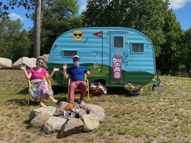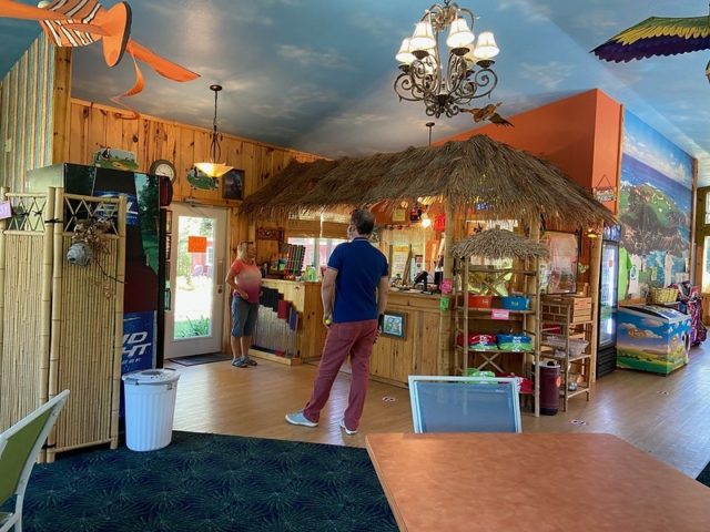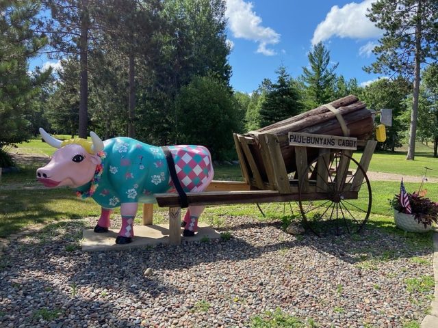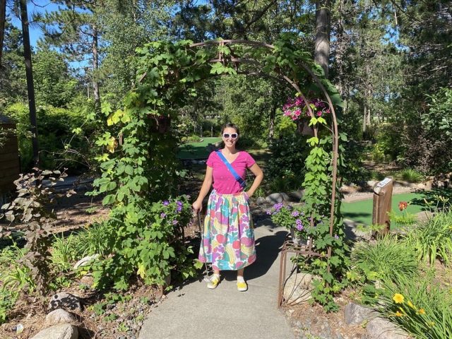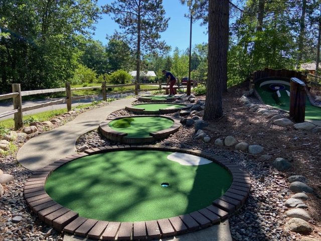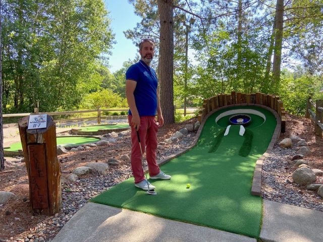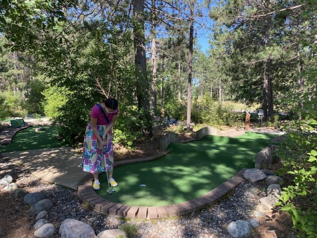 Jill gave us a bit of backstory. Many years ago, she and her family took trips to Hilton Head and Myrtle Beach, SC to play and research mini golf. They played over 4000 holes and took photos of their favorites. They came back to Minnesota, laid out all of their photos and chose the very best. They used these as the basis to make their own custom course, nestled away on their campground in northern MN.