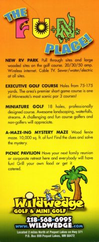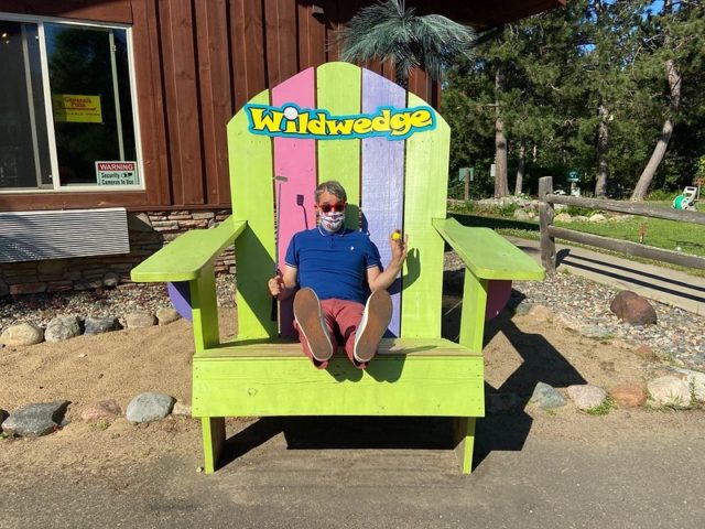 This past spring we received an e-mail from Jill Beyer, the owner of Wildwedge Golf & RV Park, inviting us up to play their mini golf course. This helped prompt us to plan a short trip up to the Brainerd area of Minnesota to play a handful of courses that we’ve never been to. There were a lot of fun courses, but Wildwedge definitely stood out. Located just off the main route 371, this campground and RV park has a golf course, a giant maze, a small area of lumberjack shows, a cute clubhouse and of course, the 18-hole mini golf course.