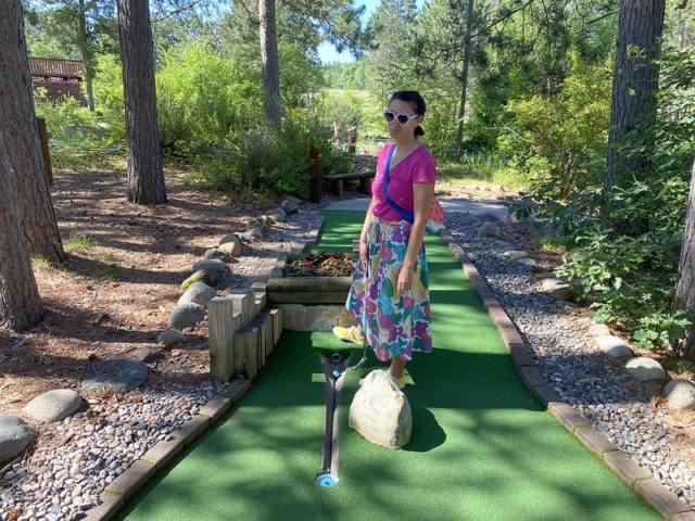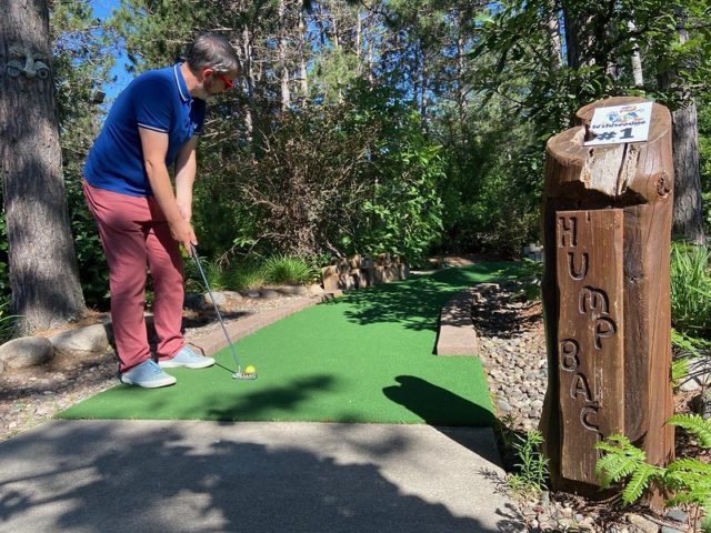 The hole designs on this course are definitely unique to MN and offer a fun variety of skill challenges and luck shots. There are jumps, water hazards, pipe play, skee ball, tiered greens, hills and valleys to overcome. The greens are surrounded by lots of trees, natural plant life and water features. The course is dotted with wood signs that name each hole and small decorative embellishments that add personality. Everything is clean and impeccably maintained. The clubhouse is warm and welcoming, covered in golf memorabilia and decorated with a tiki theme. If we weren’t in the midst of a global pandemic, we would definitely have taken more time to hang out in there. This course is truly a gem, but is tucked away, so make sure that if you’re in the Brainerd/Nisswa area, you seek it out.