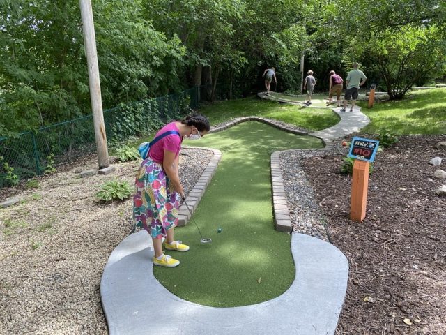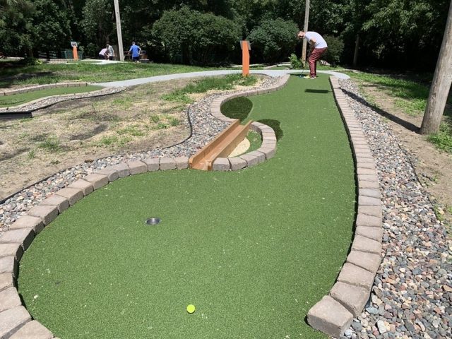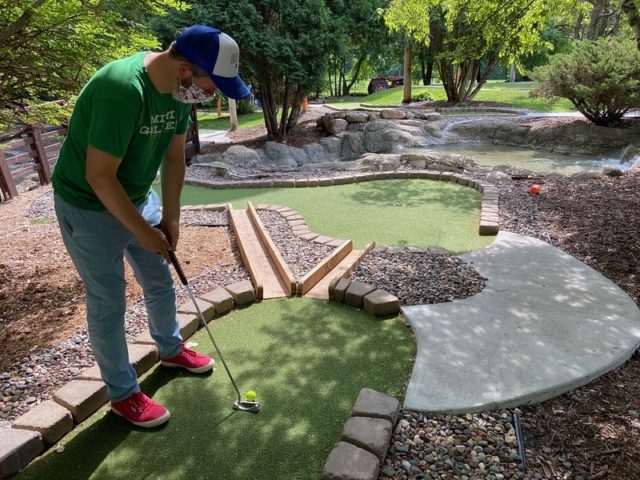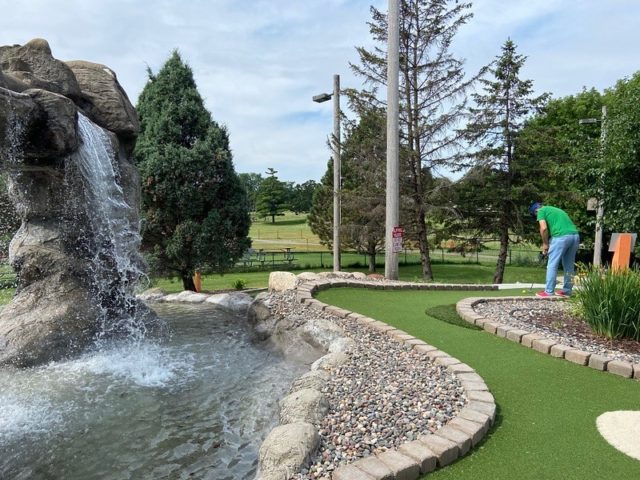 Par – New concrete, new turf, new (metal) cups, new wooden putting bridge obstacles and new signage are all part of the improvements that went into this course over the last couple of years. The crowned and wide-rimmed metal cups make for a challenging and sometimes frustrating second putts, however this course is no longer frustrating because of poor maintenance and upkeep. The course is tucked away under trees, so is well shaded for hot summer days. The central waterfall feature still stands, which adds to the ambiance. While the course still lacks the imagination that we seek in our top ratings, MaltTees has easily become one of our go-to mini golf stops throughout the summer of 2020.