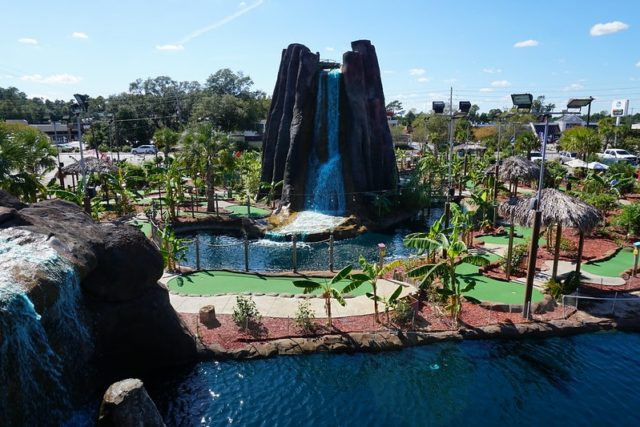 Birdie – The 18-hole Island course is played 4 times over the first two days of the annual US Pro Mini Golf Masters tournament. Both of the Aloha Mini Golf outdoor courses circle around a massive volcano that regularly rumbles and blasts out plumes of fire for dramatic effect. Tropical plants, large water features near the front of the course, and well placed tropical-themed obstacles help provide an immersive experience. No surprise that the course was impeccably maintained due to the international tournament being hosted at the time of my visit but I get the sense that all of the Aloha courses are kept up in a way that is appealing to those who want a consistent putting experience. The subtlety of the hole design makes it an ideal course for a competition but after a while, the holes feel a bit simplistic. Ultimately, this course and overall mini golf complex is a most worthy visit amongst the droves of mini golf options in town.