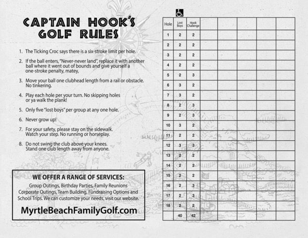 - Two 18-hole courses (Lost Boys & Hook’s Challenge). Hook’s Challenge – Par 42, Lost Boys – Par 40