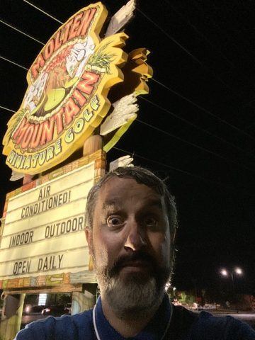Immediately after my improbably 7 hole-in-ones at Captain Hooks, our band of merry mini golfers made our way across town to Molten Mountain. Rudy and Aaron from O-Street had already taken in this joint and highly recommended it. Aaron opted to practice over at one of the official Masters courses so Highlighter, Rudy, and I met up with Randy Rice and Mandy from The Putting Penguin. Given the high level of competitiveness in our crew, we faced off on the outdoor course, Pele’s Revenge, for one of the plastic trophies sold in the gift shop.