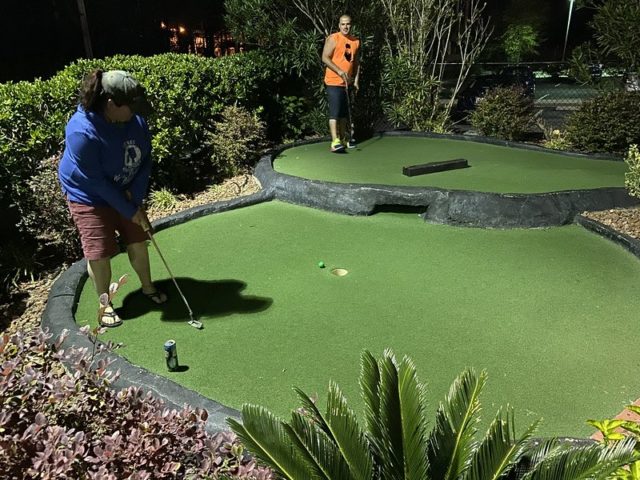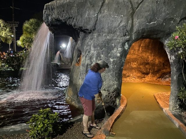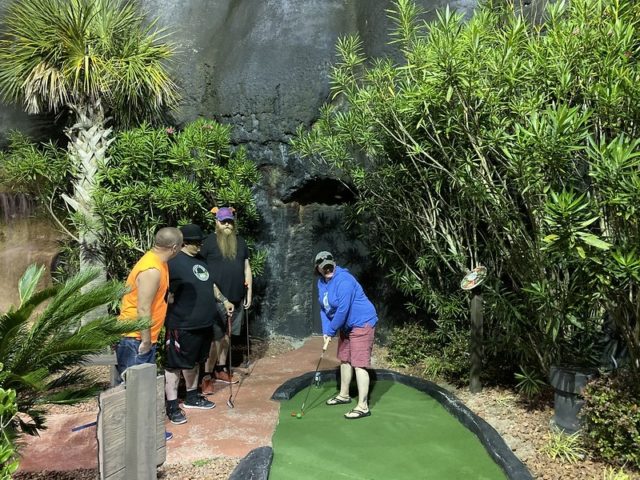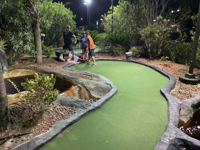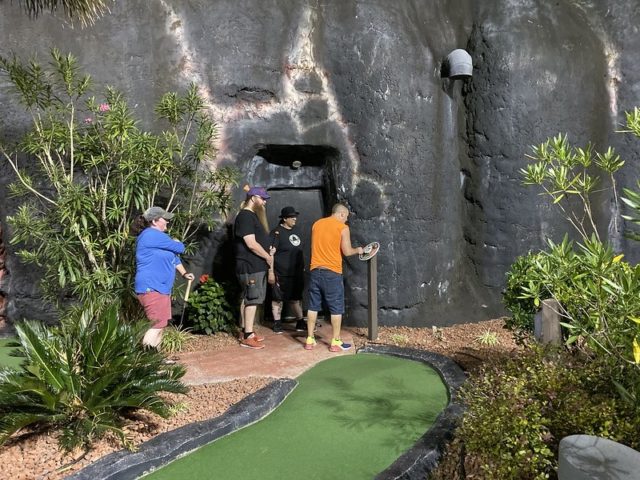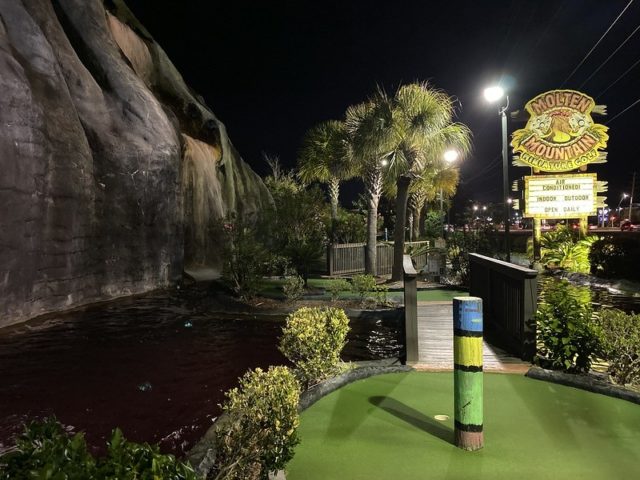 Birdie – A Tropical themed mini golf course centered around an oversized volcano is a relatively common trope to find around the world but surprisingly, Myrtle Beach has a minimum of 3 courses of this style alone amongst the 25+ miniature golf complexes in the city. Hawaiian Rumble is by far the most impressive course in this tiki-themed style but much like Aloha Mini Golf, this facility offers well above average indoor and outdoor options. The outdoor course has moderately long and relatively challenging holes surrounded by smooth cement walls. Mischief spinners are available at all of the outdoor holes to throw in a monkey wrench to the gameplay if you so choose. The red lava themed water, caves, and tiki poles bring an extra level of immersion into the theme that the best courses provide. A strong mini golf option for friends and family.