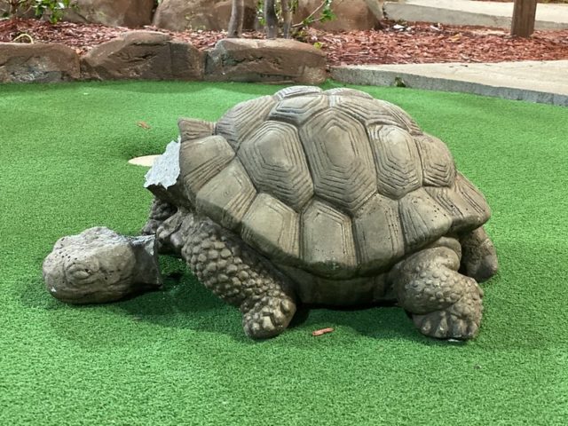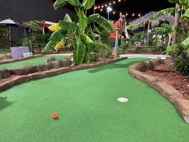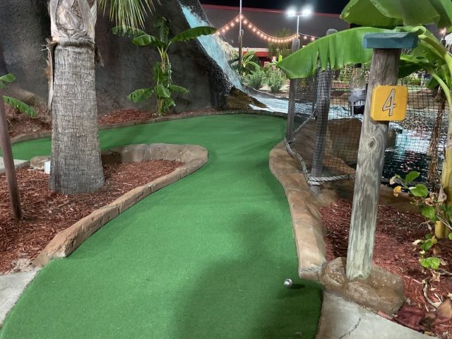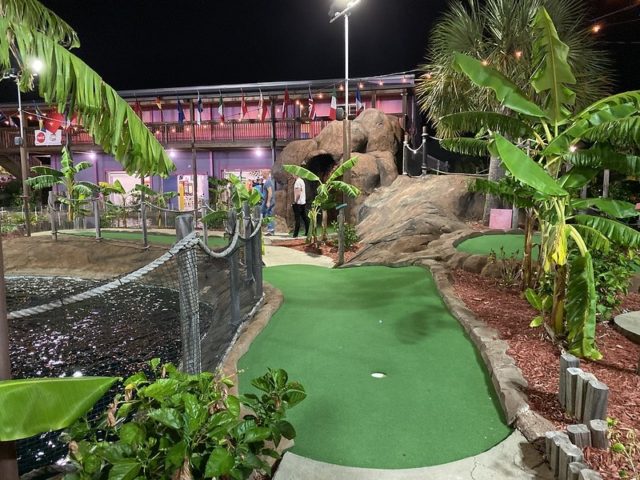 The other half of this relatively new mini golf complex that hosts the annual US Pro Mini Golf Masters tournament is much like the tournament Island course. This 2nd outdoor course takes you on a trip around a massive volcano that regularly rumbles and blasts out plumes of fire for dramatic effect. Tropical plants, large water features near the front of the course, and well placed tropical-themed obstacles help provide an immersive experience. Well maintained greens and a subtle hole design that makes it an ideal course for testing your skills. Mini golf pros would know the difference between the two outdoor courses but after a while, the two outdoor courses blend together and are relatively straightforward.