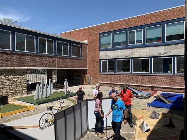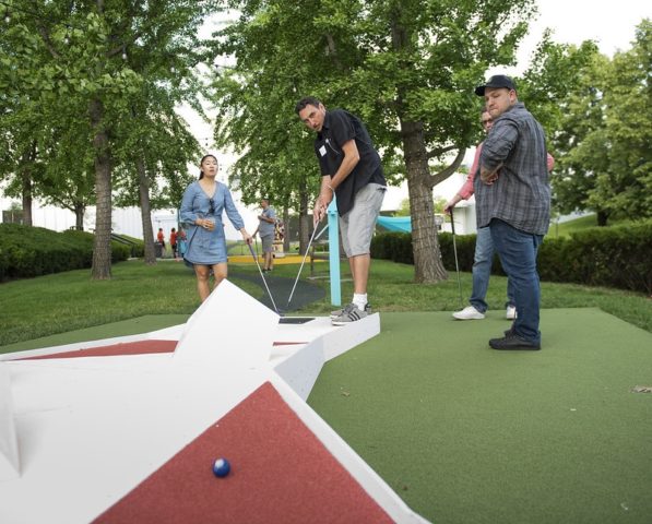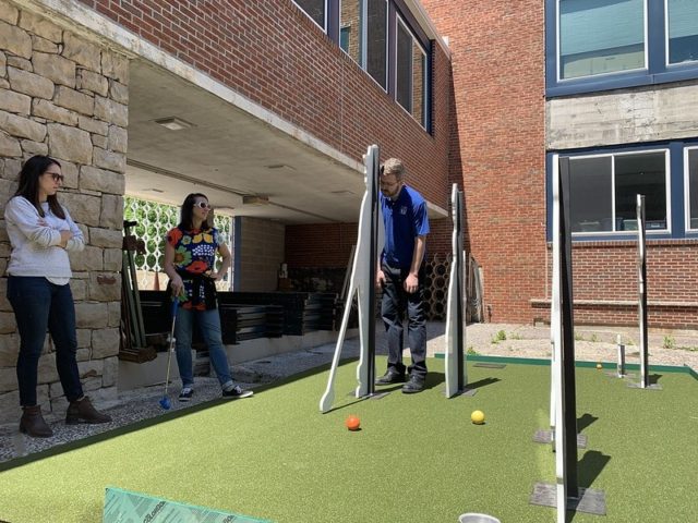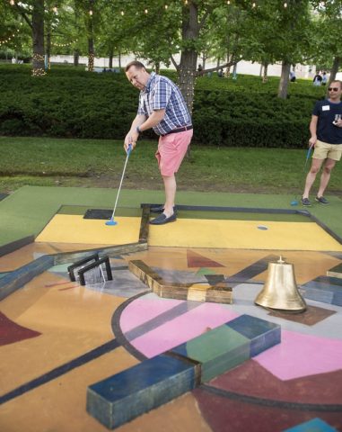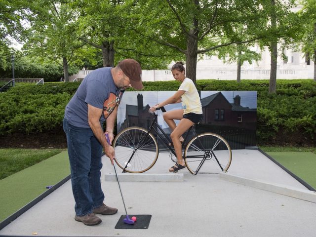 First visit to the location in January 2018Pink tape marks off future locations of the holesThe Nelson-Atkins staff William created several amazing mock-ups of the selected designsFast forward to the fun part! Testing out the holes in the shop at A to Z in Kansas City.Testing the Plinko hole inspired by: Vasily Kandinsky, Rose with Gray, 1924. Designer: John GlessnerIn progress build of The Mischievous Dragon – Inspired by: Chinese, Vase, 1426-1435. Designer: Kelly Batcheller-MummeyThere were so many holes that they took over the entire courtyard!Testing out a hole inspired by: Edouard Manet, The Croquet Party, 1871. Designer: Richard FarnanThe Pink Putter tests out Heaven Putt Hell – Inspired by: Marsden Hartley, Himmel, circa 1914-1915. Designer: Parker StoryTesting Pedal! – Inspired by: Evelyn Hofer, Girl with Bicycle, Dublin, 1966. Designers: Jacob Hodson & Jesse CrupperTesting Zoomy – Inspired by: Mark Di Suvero, Rumi, 1991. Designer: Brett PaytonHangin’ with the crew
