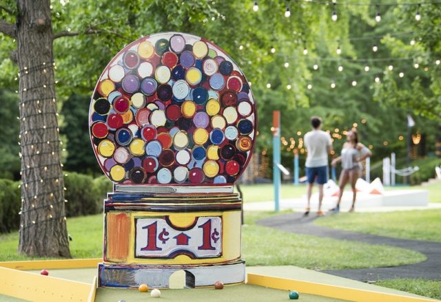 After going on hiatus for the 2020 season due to COVID, Art Course 2021 will return this year and add a new hole, “Eyy Putter Putter Swing”. This hole was inspired by Radcliffe Bailey’s Mound Magician, designed by Sierra Swift and fabricated by Dimensional Innovations. The new hole is in honor of 100th Anniversary of the Negro Leagues and the Kansas City Monarchs.