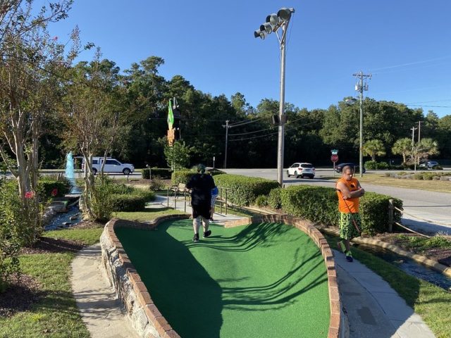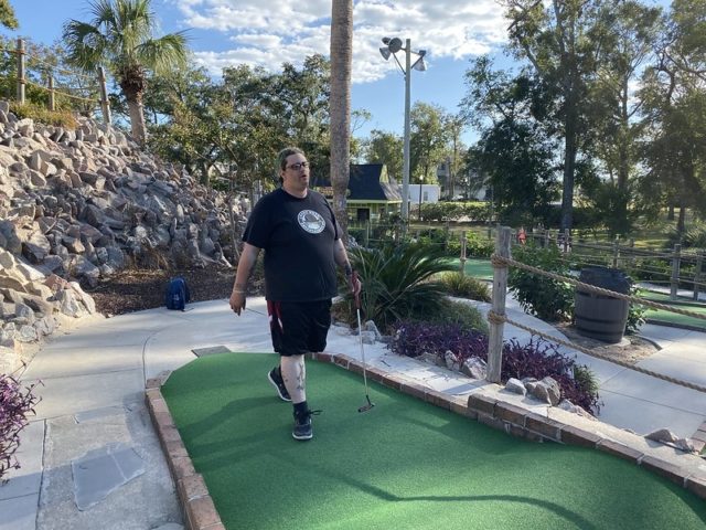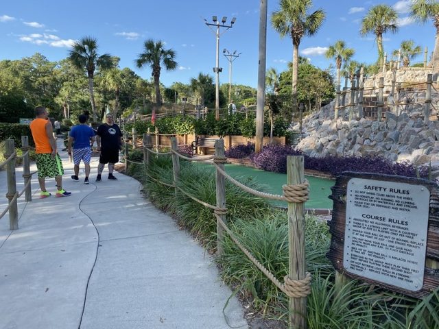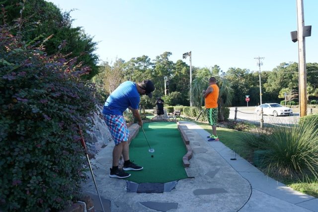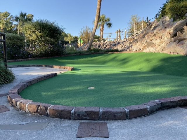 Dinosaurs on courses ended up being surprisingly easy to find in Myrtle Beach, but I believe this was the only course that had full-on animatronics for their prehistorical characters. The full scaled T-Rex at the midway point of the course was clearly inspired by the Jurassic Park film franchise and it was one of many set pieces on the course meant to connect the dots with the ill fated fictional dinosaur park. It was a glorious spectacle and had me waiting in anticipation for the moment it disrupted putters out on the course. The corny cut-out photo ops and other little flourishes throughout made for an overall charming environment. Coming from the north, we don’t see palm trees nearly as much as we would like and they felt at home in the overall course next to all the water features. We had a few fussy cups that caused an unusual amount of balls bouncing out but otherwise, the course played well. Our group had an above-par experience and this is yet another solid course worth checking out if you’re in the Myrtle Beach area.