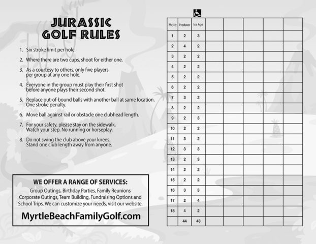 - Two 18-hole courses (Ice Age & Predator). Ice Age – Par 43, Predator – Par 44