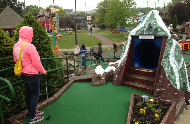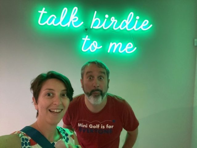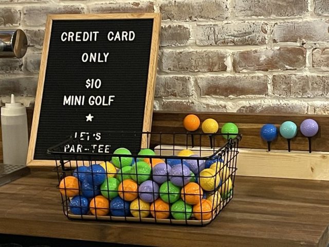 After playing a round, we headed back up to enjoy our food. While we normally don’t review food at the mini golf courses we visit, we’ll throw in a rave review for our meal at Libertee Grounds. We ordered Kimchi Mac & Cheese bites, Laotian Crispy Rice and the Hummus Tandoori and everything we ate was unique and delicious. We’d definitely eat there again.