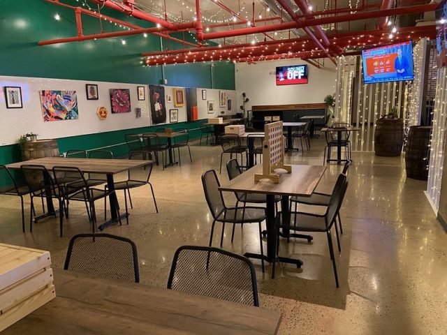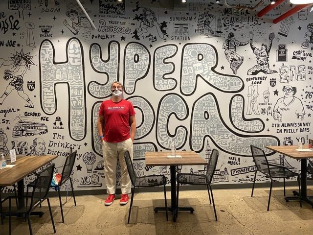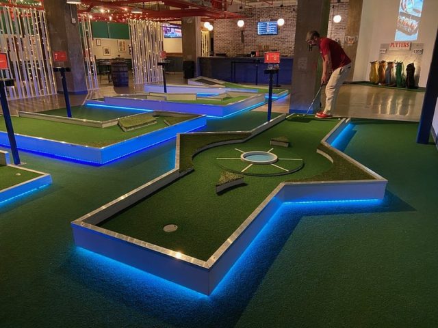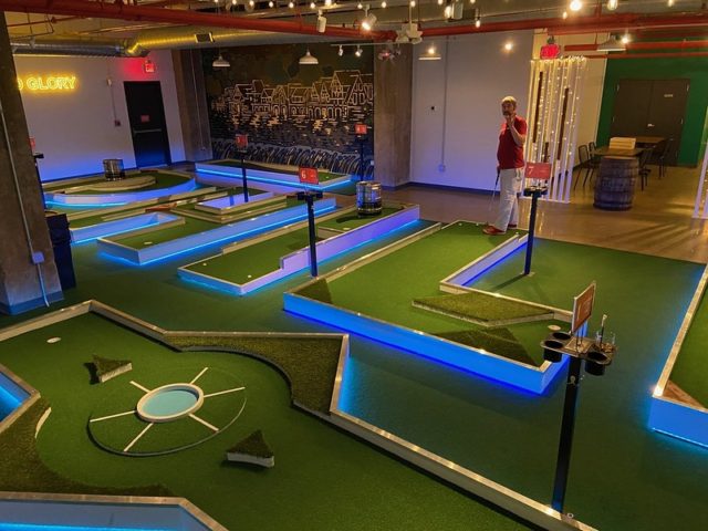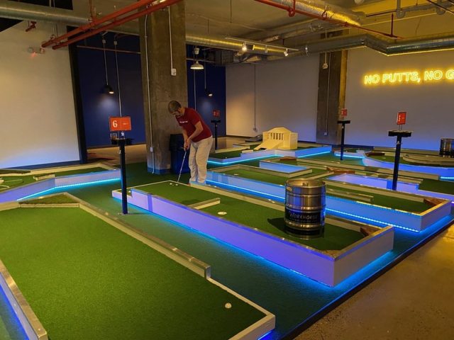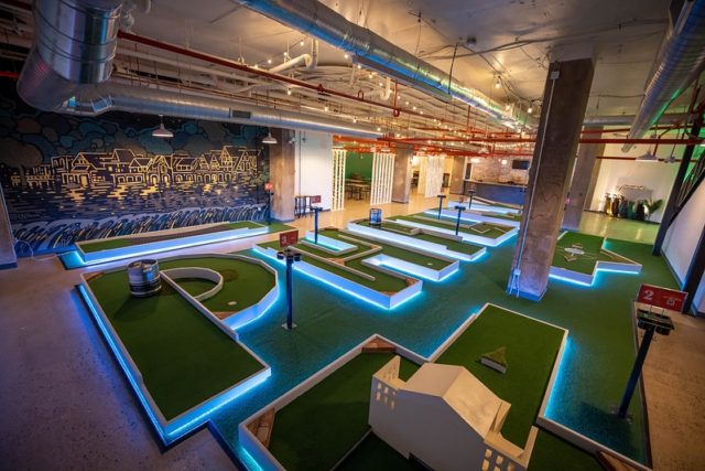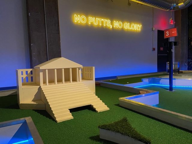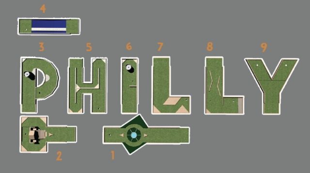 The course in super unique in that six of holes are shaped to literally spells out the word “Philly”, and then the other three round out the Philly theme with nods to local landmarks. The game play is fun and challenging and is directly designed around the shape of each hole/letter. Because it’s located in a basement, the temperature is cool and without windows, the owners were able to be intentional about their lighting choices, which included a mix of string lights and LED neon. An added bonus was the mural of Philly’s boathouse row behind Hole 4.