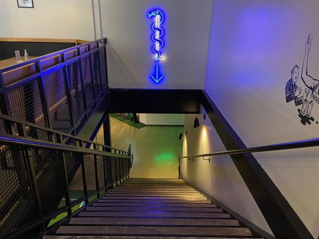 Upon entry to Libertee Grounds, we were required to show our Proof of Vaccination. After that, we were give wristbands and wearing masks became optional. All of the staff kept their masks on regardless. This, in combination with how quiet it was (we got there right when they opened), made us feel comfortable enough to grab some food and drink. The entire upstairs/main floor is the bar and restaurant featuring pan-Asian fare, with the mini golf course and game area in the basement. We started off our experience with a cold drink and put in an order for a variety of Happy Hour snacks. While were were waiting for our food, we headed downstairs to check out the course.