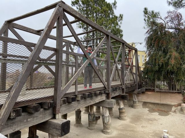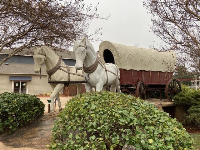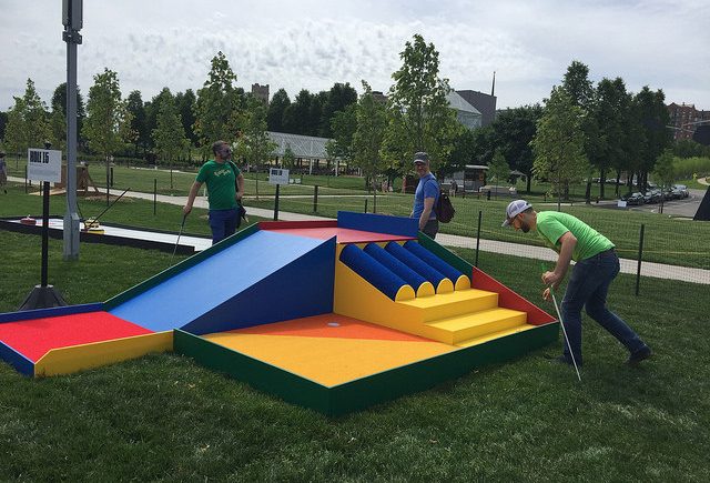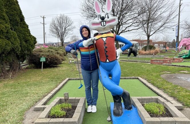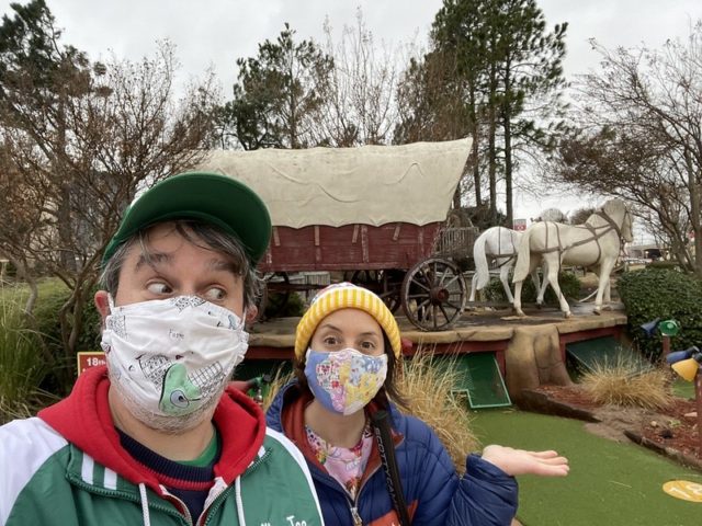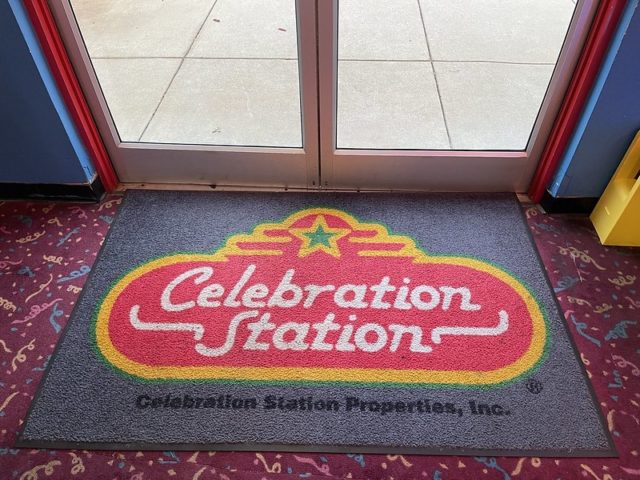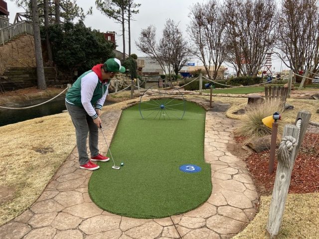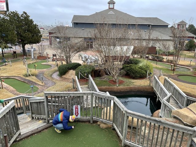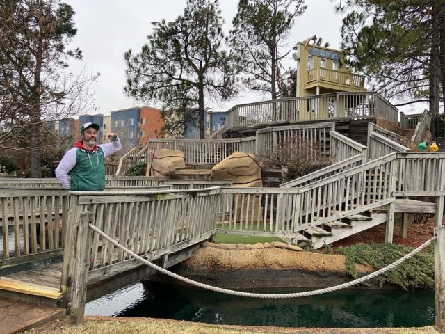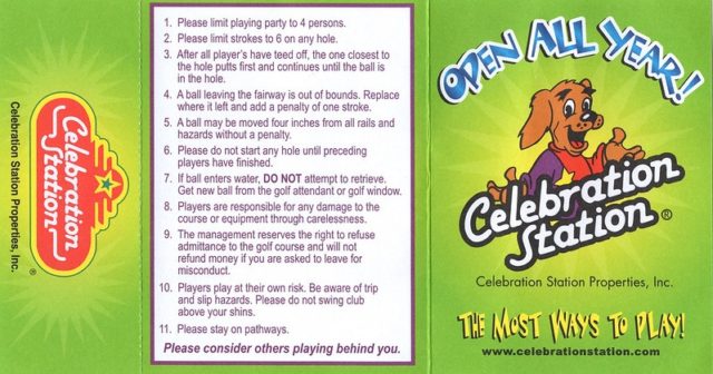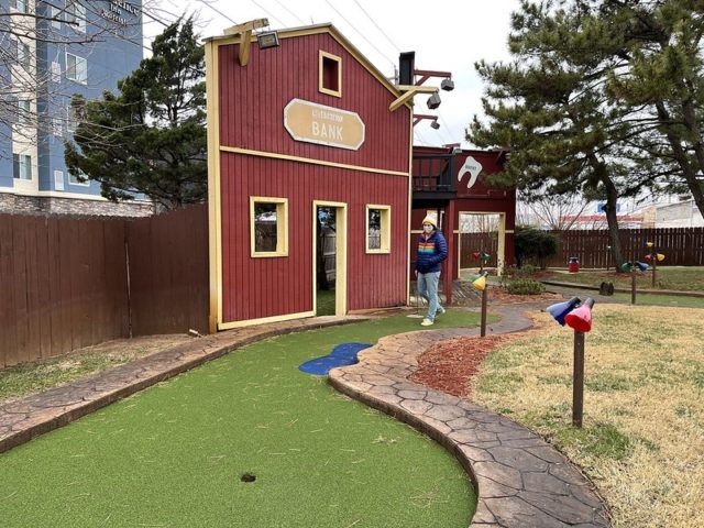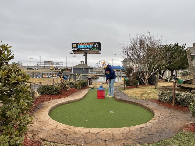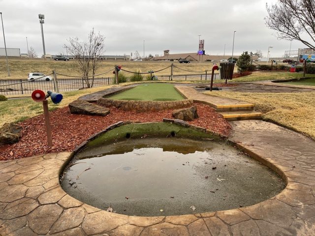 Celebration Station is a chain of Family Entertainment Centers located in Louisiana, Florida, North Carolina, Texas and lastly, Oklahoma. Their OKC location has three 18-hole mini golf courses (Course A, Course B and Course C), all of which have a western theme. Because the game play and theming on all of the courses are so similar, we’re reviewing them together as one. The mini golf at this Celebration Station would fall into the category of what we typically deem as “West Coast Style” – the greens are dropped in below sidewalks which are dotted with colorful lights. The game play was mostly straight forward, with some humps, berms and pipes adding to the challenge. Some of the holes had small water hazards or simple obstacles such as wagon wheels, metal cans and painted wood blocks. The courses were decorated with some faux western facades and a conestoga wagon. In the middle of Courses A and B was a small “mountain” which had on it a central water feature, holes 16 and 17 for both courses and more faux western town facades. Because we played in the off season, the weather was bleak and the course greens were in rough shape (landscape debris, flooding, etc.) This would be a great place to brings kids for a birthday party or to run around, but it is definitely not a course we’d recommend going out of your way to play.
