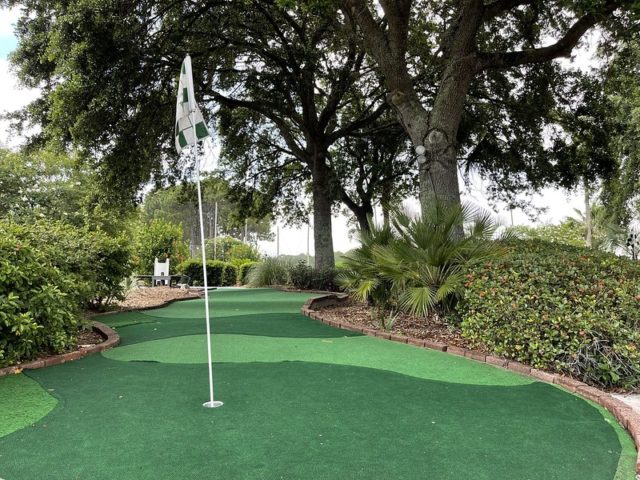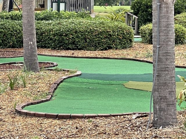 This mini golf course is connected to a larger golf center. From what we could tell, the water hazards and a few other things were either under repair or not fully functioning. All of the holes seemed to be fairly long with a lot of smart sloping and gameplay. As you can see in the photos below, the turf has seen much better days. Visually, the contrast of the different types of turf is a nice touch but it’s clear that the transitions from one style of turf to the other will cause the ball to move quite a bit. We’d love to swing back here next time we’re in the area if they fix it up. The best version of this course would definitely line up with some of the better skill-focused putting courses we’ve played.