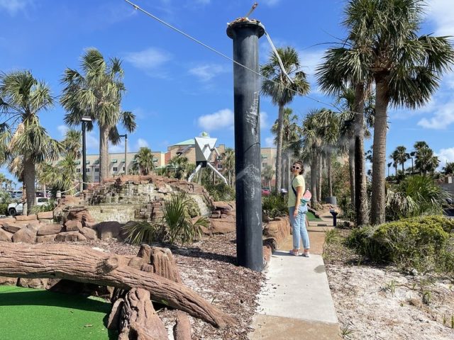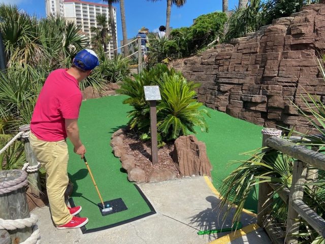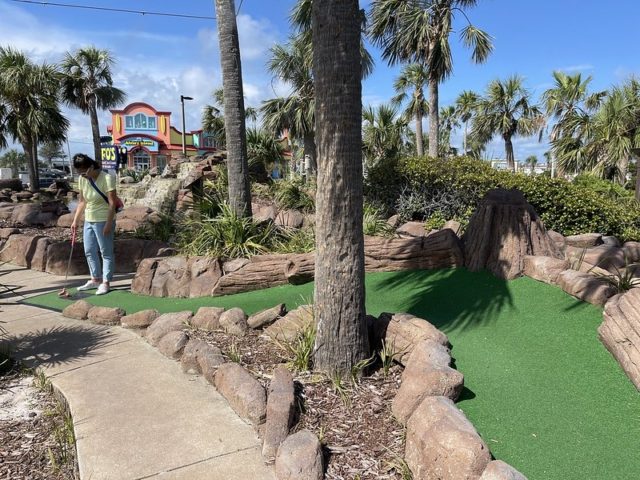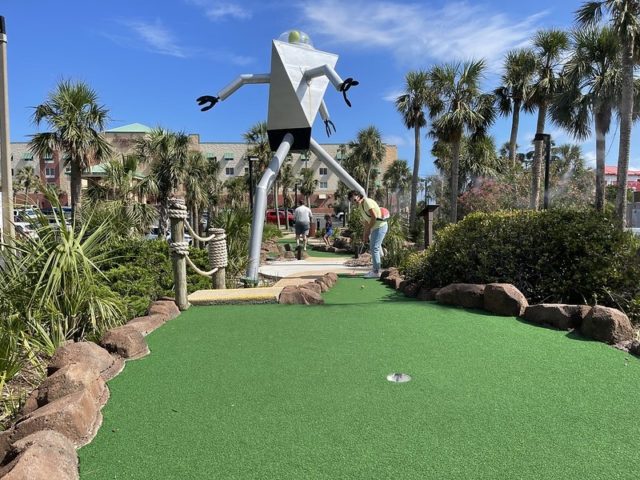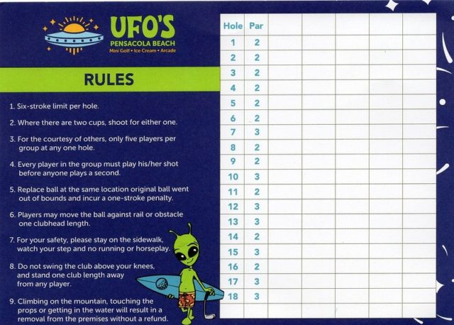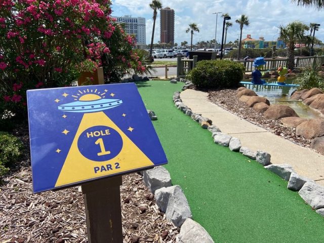 UFO’s Mini-Golf had obviously been a different, more generic course under previous ownership. It appears that whoever bought it revamped the theming by adding new branding, signage and some cosmic enhancements onto the course. While the out-of-this-world elements were humorous, they were not so stellar and couldn’t disguise the fact that this course has seen better days. Being the only beachside option, it seemed to be a popular choice, but there are definitely more distinctive mini golf destinations in the Destin/Pensacola area.
