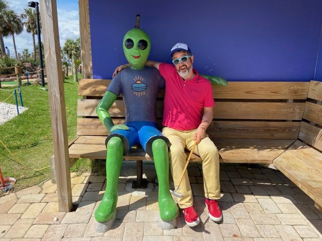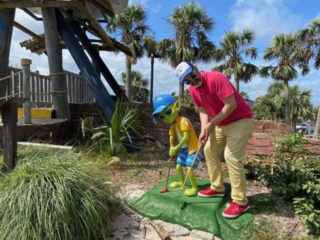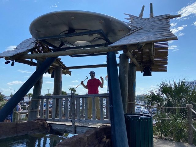 On our June 2021 Florida Panhandle birthday mini golf binge, Mr. Tee and I flew into Pensacola and drove our way west towards our AirBNB in Destin. On the drive, we took a scenic detour through the heart of Pensacola Beach and stumbled upon UFO’s Mini-Golf, making it the first official game of our trip.