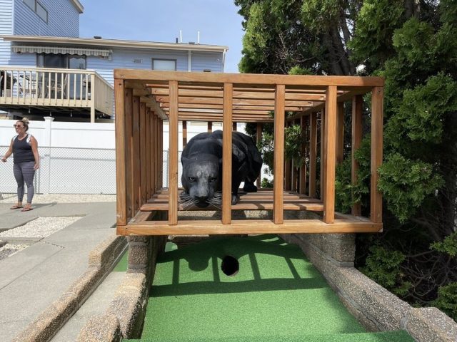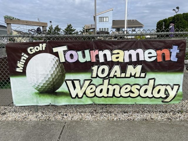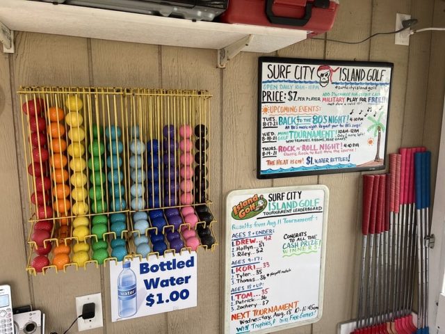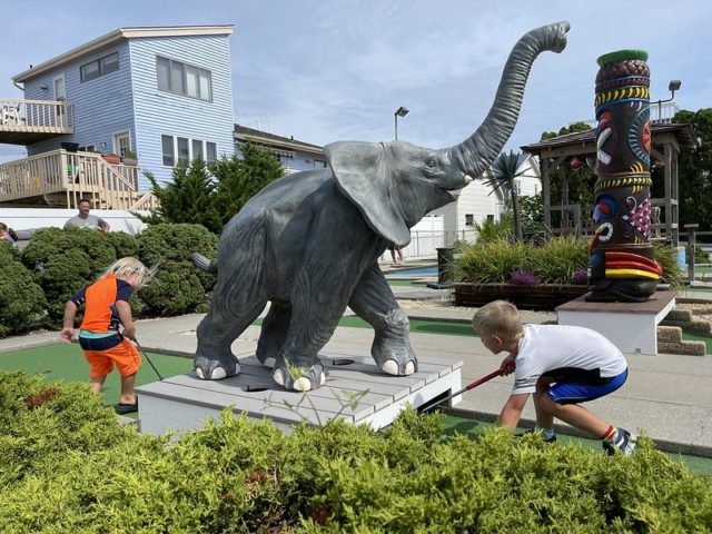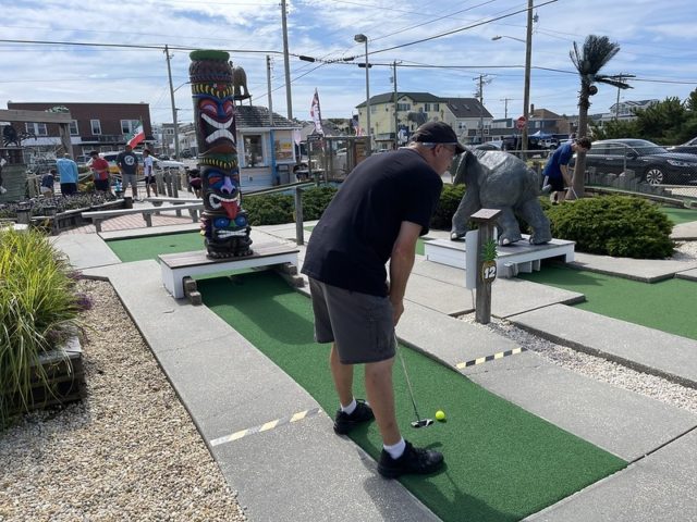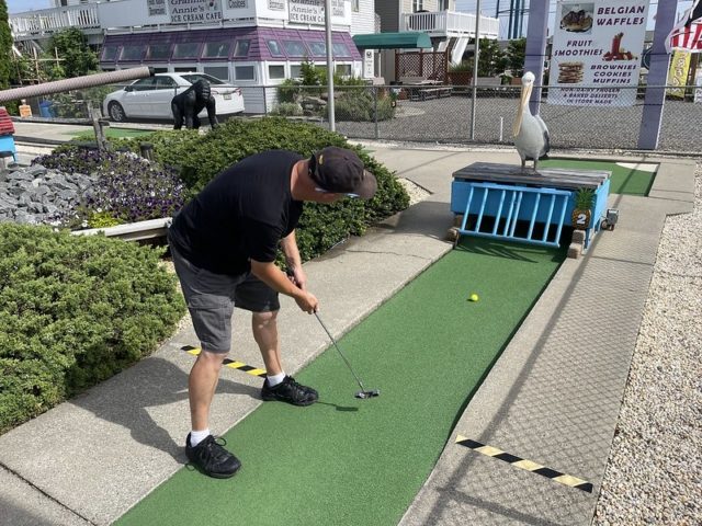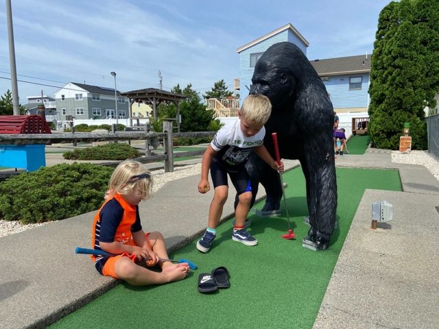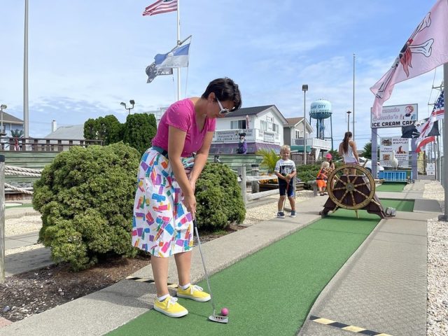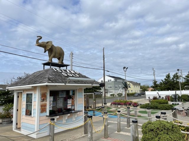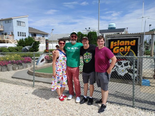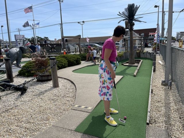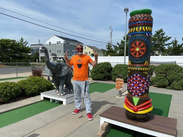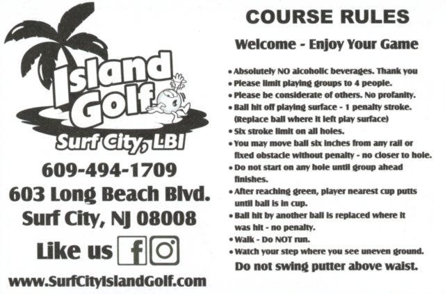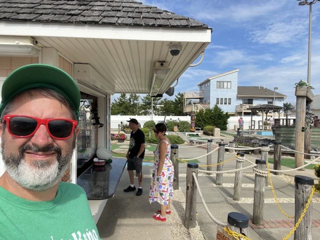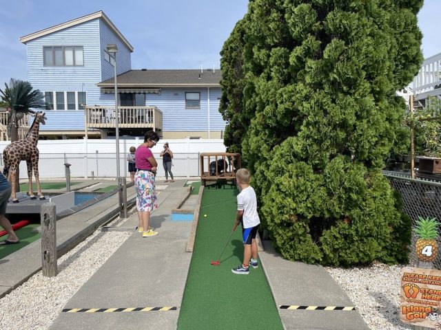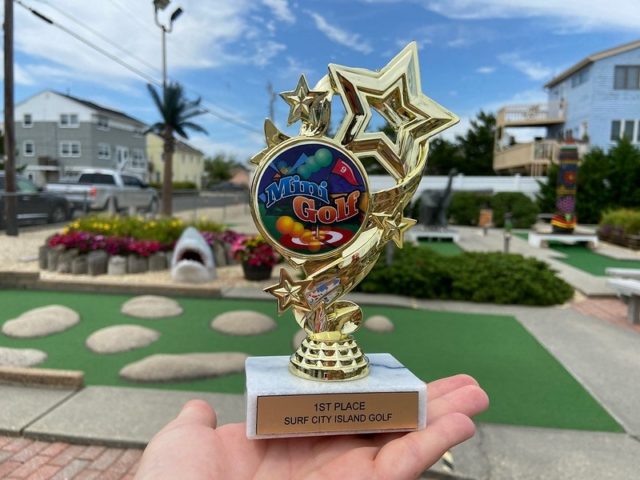 In August of 2021, we took a vacation on Long Beach Island with my family, something we did often when I was a kid but hadn’t done in at least 20 years. I was excited to visit all of the mini golf courses on the island, one of those being the appropriately named Island Golf. We got to to play this course twice – the first time was early on Tuesday morning with one of my best friends Maggie and her two kiddos, Q and J. The second time was for their weekly Wednesday tournament, which we played with David Biggy (of Can You Beat Biggy? and Holey Moley fame) and William, who we had met earlier that morning at the Hartland Golf tournament just down the road. And I was lucky enough to take home the winning trophy for that week’s tournament!