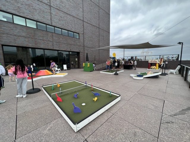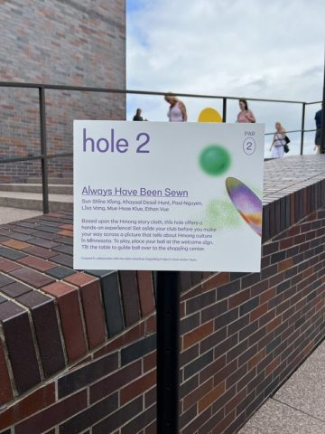 “Celebrating its 15th anniversary, Skyline Mini Golf returns to the Walker rooftop this summer! The ten-hole, artist-designed course features a new design created by the Asian American Organizing Project’s Youth Action Team called Always Have Been Sewn. The work is based upon a treasured and historical Hmong item called a paj ntaub (pronounced “pan dow”), or story cloth.”