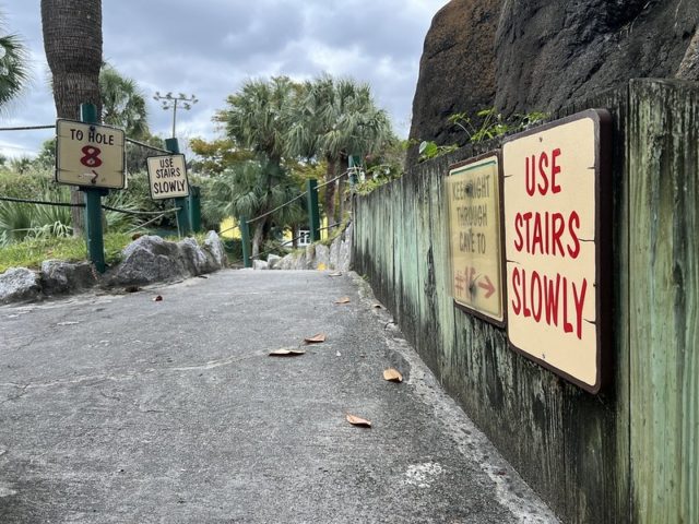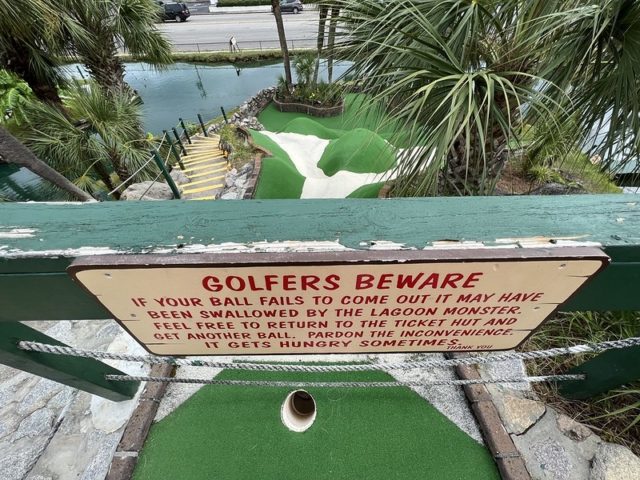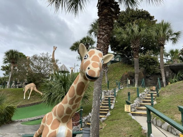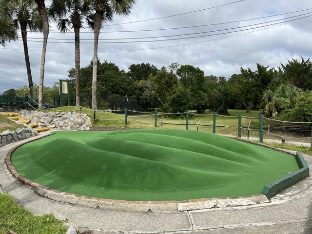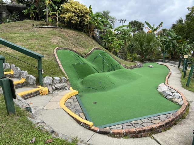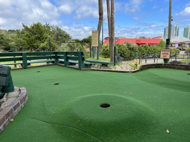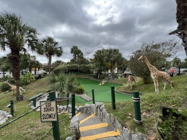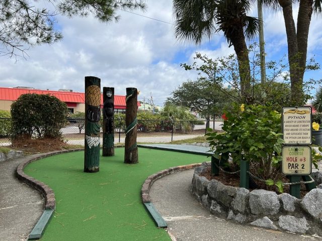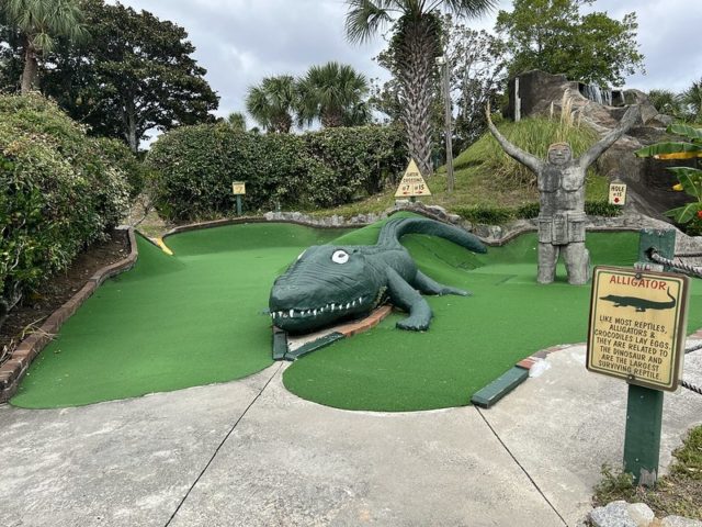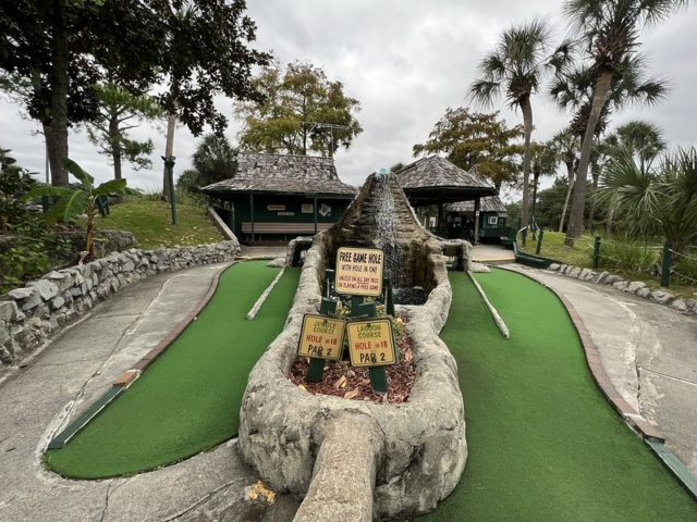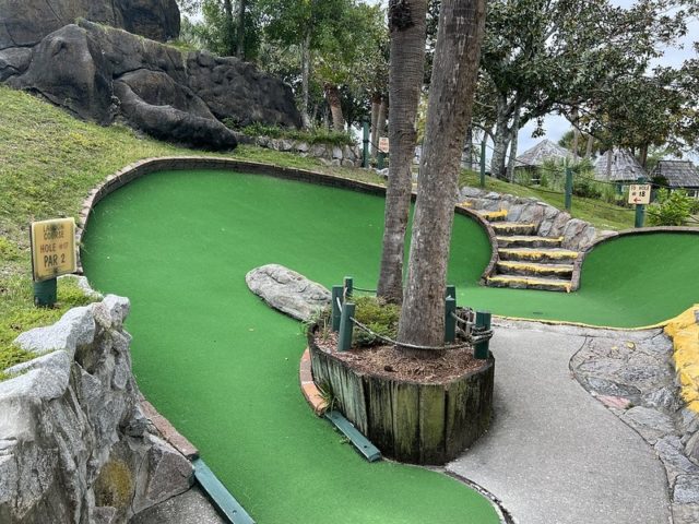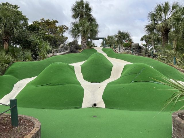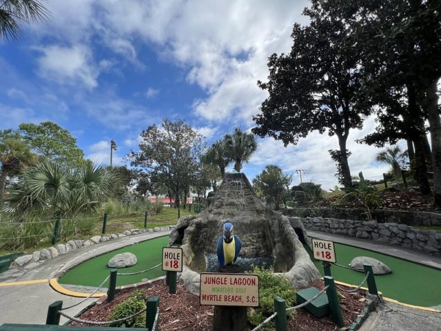 The safari and tropical themes are far from unique, especially in Myrtle Beach, but Jungle Lagoon combines both well and is one of the best-executed takes on these separate themes. Large fiberglass animals and a lagoon near the road give the place an immersive vibe. This is not uncommon in Myrtle Beach and neither are the somewhat oversized holes that seem to be a “thing” in a town overflowing with miniature golf courses. The little touches are what makes this place stand out. The path to the cup offers a lot of different approaches using large curves, wood borders, and sharp changes in elevation. Heck, sometimes you have all of those elements within a single hole. The classic handpainted signs with information about the animals had a retro feel. The palm trees and foilage tied it all together nicely. The biggest issues were the condition of some of the holes. The turf and a few of the walls were not in ideal shape. Overall, it’s probably in my top 5 courses that I’ve played in Myrtle Beach and one I’ll surely go back to again on future visits.