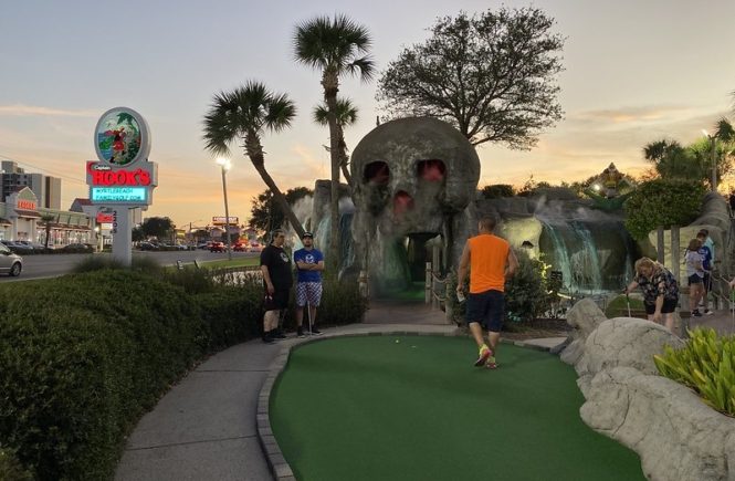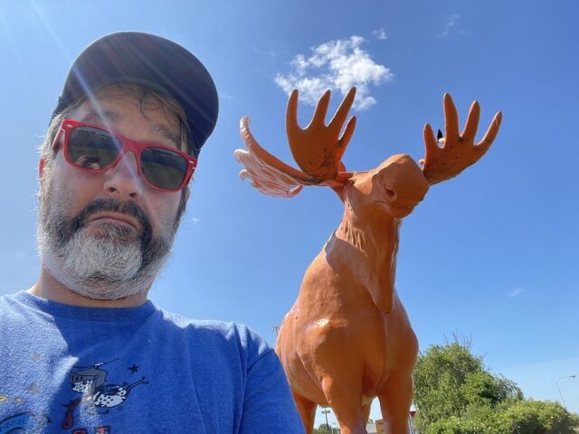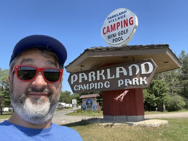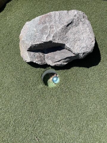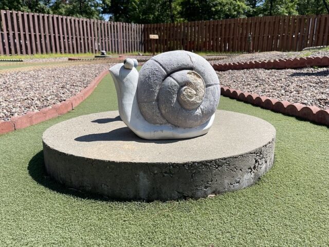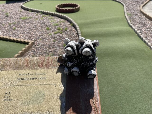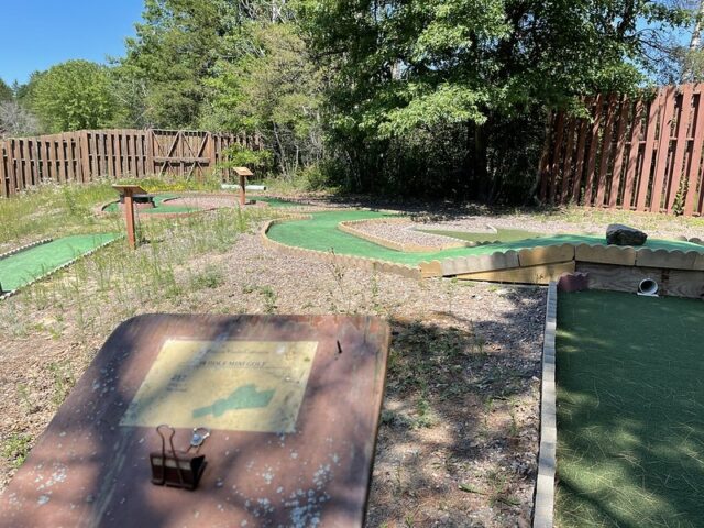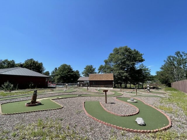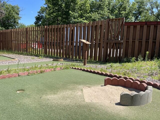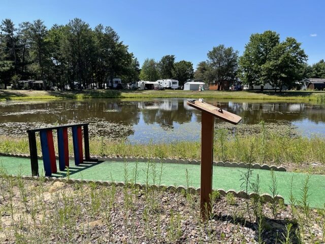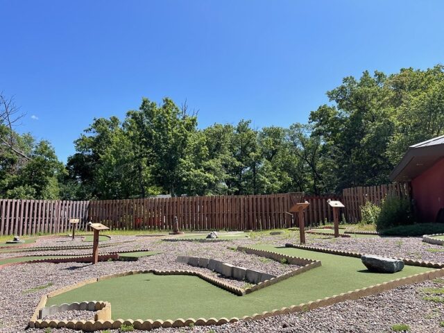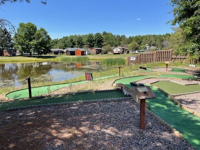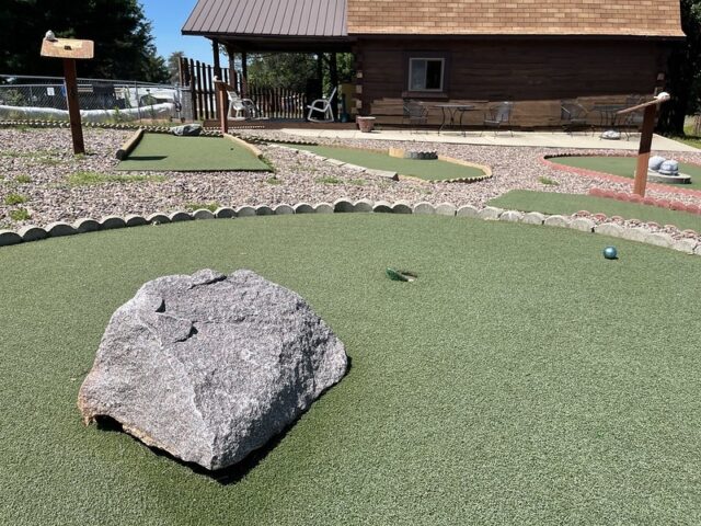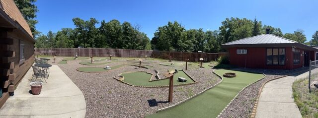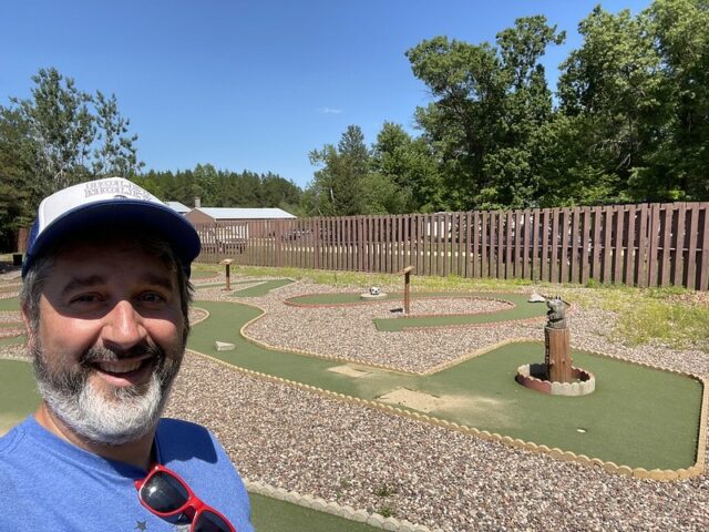 During a work holiday in July 2021, I headed solo to Chicago to play mini golf and see friends. The 6-8 hour drive from Minneapolis takes you south and east through Wisconsin on Interstate 94. Many times throughout my life I have stopped at the Black River Falls exit for gas, cheese curds, Taco Johns, and to take photos with the bright orange moose. As I was driving by this time around, I noticed a sign for an adjacent campground that referenced mini golf. How had I never noticed? I took a note for a future trip. As I was heading back home a week later, I thought it might be worth breaking up the monotonous drive and to find out whether this campground still had a miniature golf course. I pulled up to the clubhouse and the manager could tell I was serious about playing mini golf based on the fact that I had my own club and ball. After hearing about the course from the manager, I entered the fenced course and had the whole place to myself on a beautiful summer day.