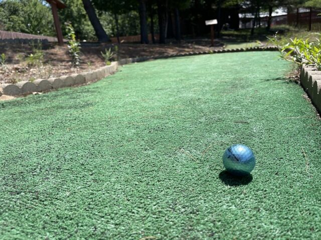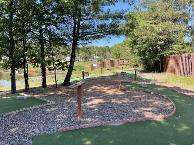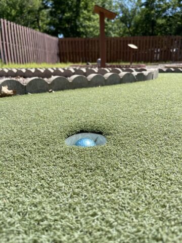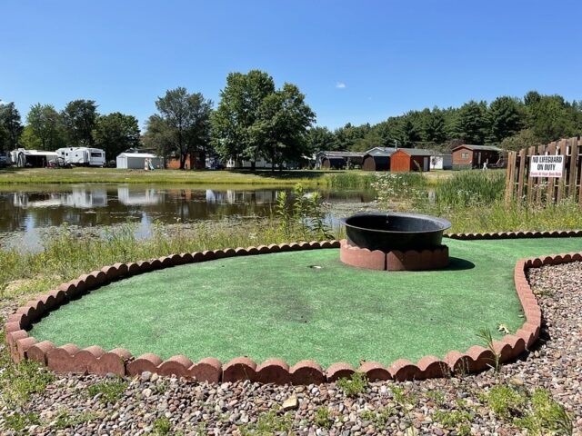 The immediate thing that stands out about this course is that it is homemade. The walls look like something you’d use for landscaping a nice yard and many of the obstacles look like items you could buy from a garden center or home improvement store. Handpainted signs, tchotchkes, a few clever obstacles, and long-putting greens stand out as the major positives of this course. Par 68 is well-earned. I barely got under par my first time playing through. Part of the reason for the challenging play is due to a few of the less ideal or idiosyncratic elements of the course. While I can appreciate non-traditional cups, a few of them are far too small. This is compounded by the current state of the turf. Midwestern winters wreak havoc on turf and the greens are overdue to be replaced. I understand this is a small amenity to a larger campground. I imagine the course doesn’t receive a massive amount of traffic or generate a lot of revenue so I don’t expect the condition to change anytime soon. If you’re heading through Wisconsin and need a stop off the highway, this is a unique and clever little course that is worth exploring.