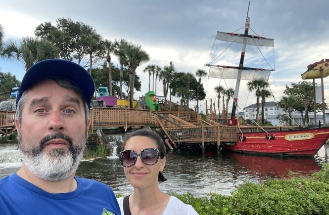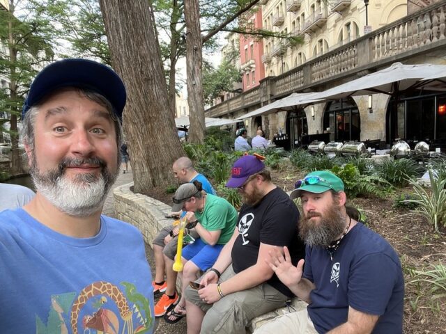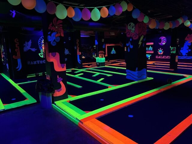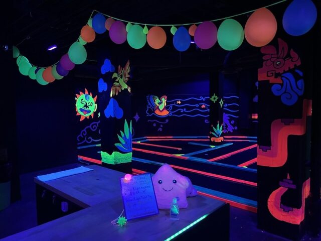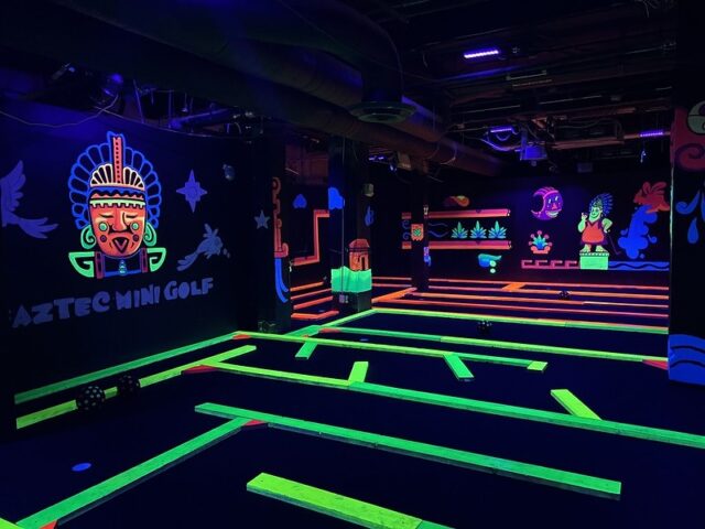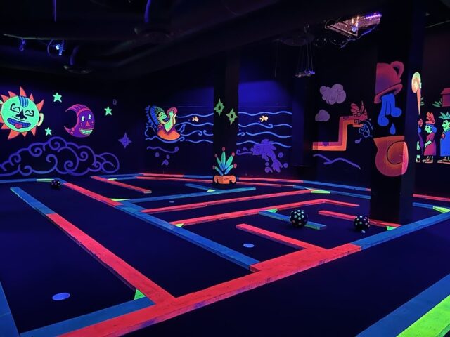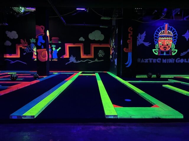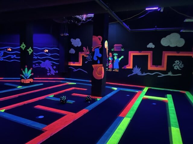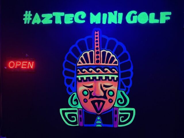 Earlier this year we had a daylong competition between friends/founders of the American Mini Golf Alliance (AMA) that spanned across San Marcos and San Antonio. After two rounds at Cool Crest and one round at the flukey and good-looking Pixar Putt, we all opted for dinner on the River Walk in San Antonio. Our crew of Pat & Mandy (of the Putting Penguin) and fellow northeasterners Highlighter (aka Mark Novicki) and Randy Rice grabbed drinks at the Thirsty Aztec Bar while we waited to get a seat. As we were getting our drinks, I saw signs for mini golf so I had to investigate. A sign boasted that you could play a round in 10 minutes and I know our whole group would have played had we not already been binging on quality courses all day and week. I opted to just snap some photos for posterity. It’s a solid, flat, and almost putt-putt-styled blacklight course with bright-colored wooden borders to each hole.
