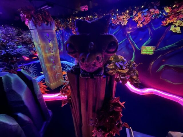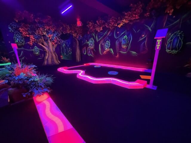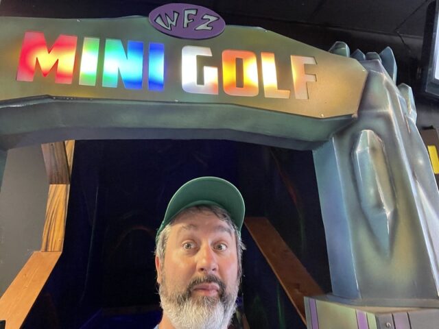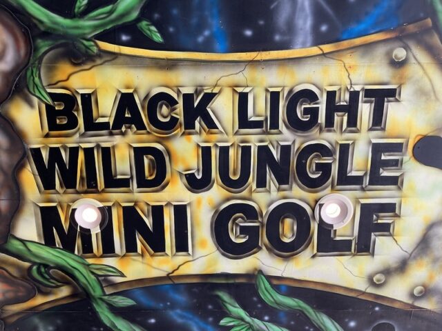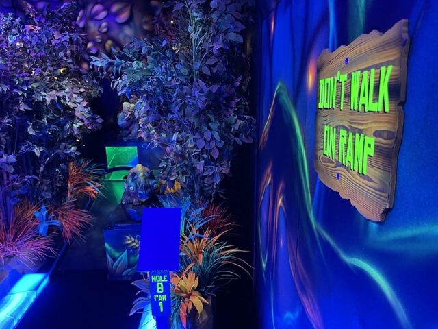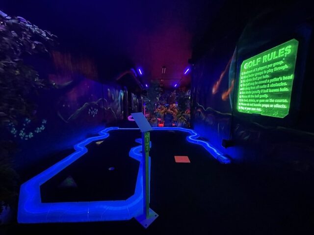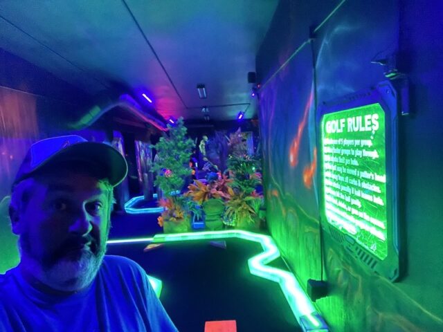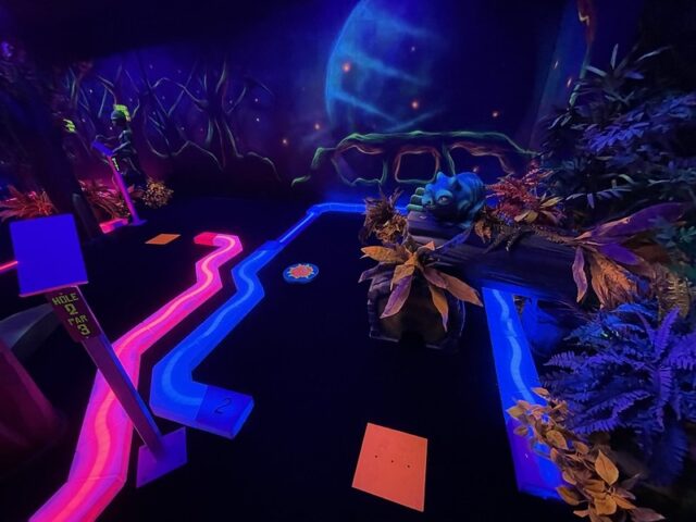 After playing the blacklight course over at the nearby Wilderness resort, I had a good sense of what to expect at Wild Fun Zone. Solid and well-built holes with the same Electric Edging used for the border walls of each hole. The gameplay is nearly similar too. Flat blacklight carpeted floors that play fairly true with obstacles that remain very close to the ground. Swap out the underwater theme for an alien theme and there you go. I did appreciate that there was some ambient music pumped in to give go with the overall theme. My one small annoyance was the unnecessary tee-off mats. It’s clear where the holes start and end. They are even less valuable on the course if they are not fixed in place. It would be quite simple to just remove them. Overall, it’s a solid well-built course that won’t blow your mind but is better than most of the outdoor options in the Dells.